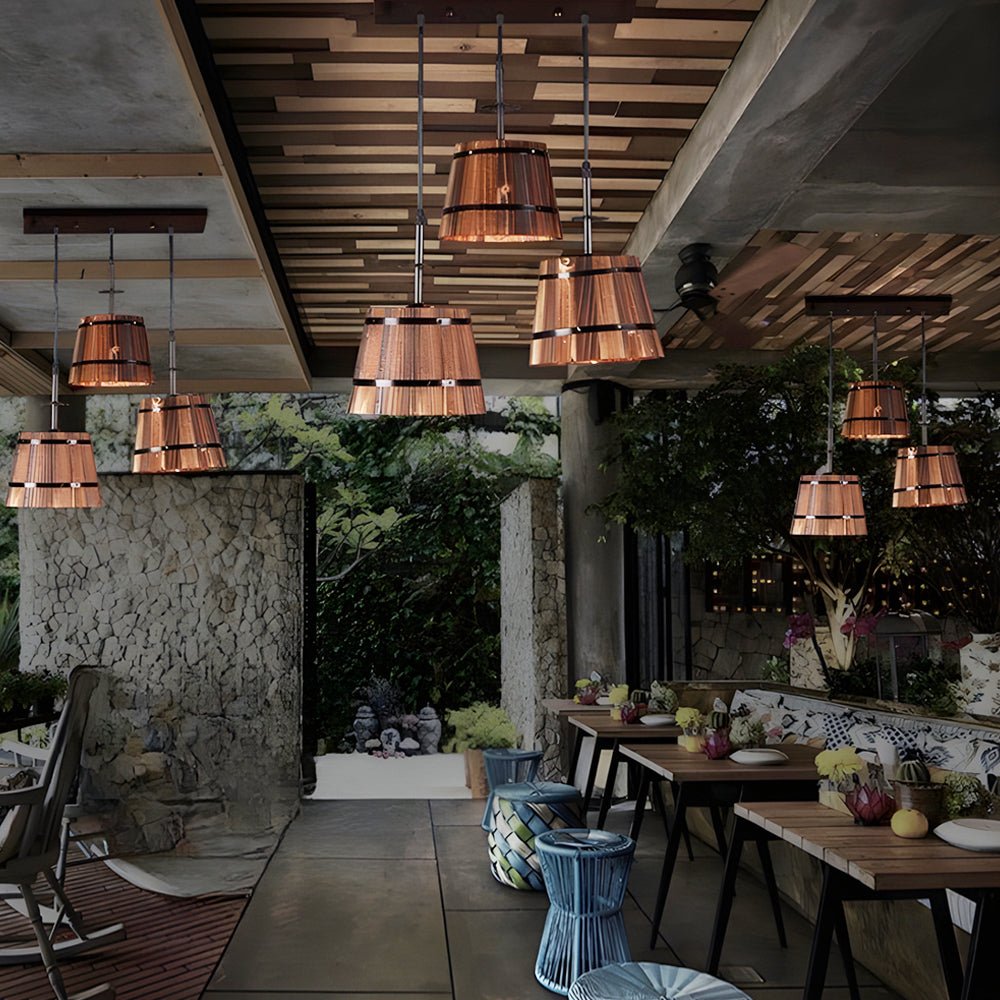 - Our Rustic Barrel Shade pendant light features an industrial-style design that blends Americana and vintage styles to enhance your space. This pendant light is crafted from premium iron and wood materials, offering timeless charm and durability.