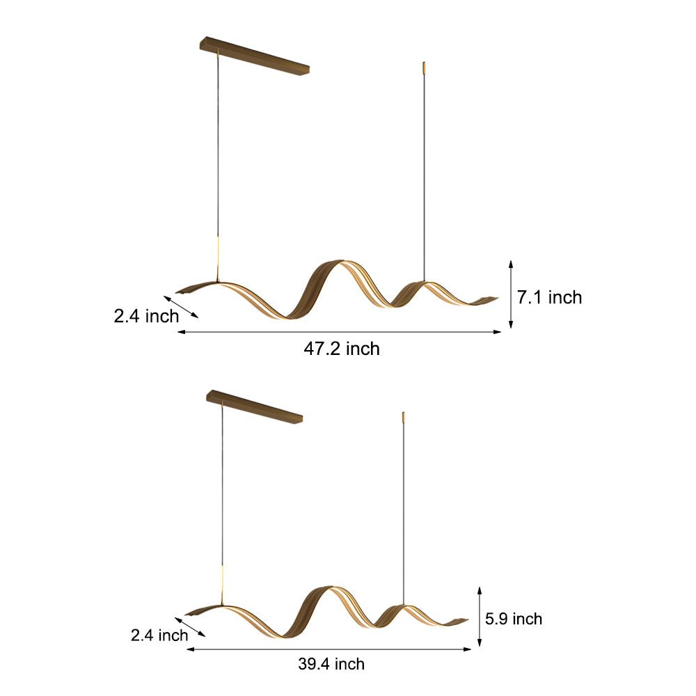 The linear chandelier showcases a distinctive, flowing wave shape, adding a dynamic visual element. Integrated LED lights offer neutral, energy-efficient illumination. Its linear form is suitable for lighting dining tables, kitchen islands, or wide open spaces.