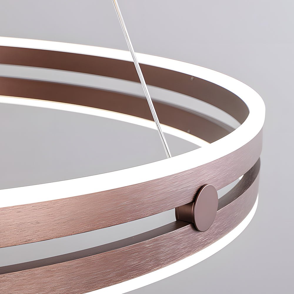 This modern chandelier features a double hoop design crafted from aluminum. It is available in three finishes: black, gold, and brown. The Double Wheel Chandelier illuminates spaces with integrated LED strips positioned along the edges of its hoops. An acrylic diffuser is included to soften the light, creating an inviting ambiance suitable for dining rooms, living rooms, kitchens, and other indoor areas.