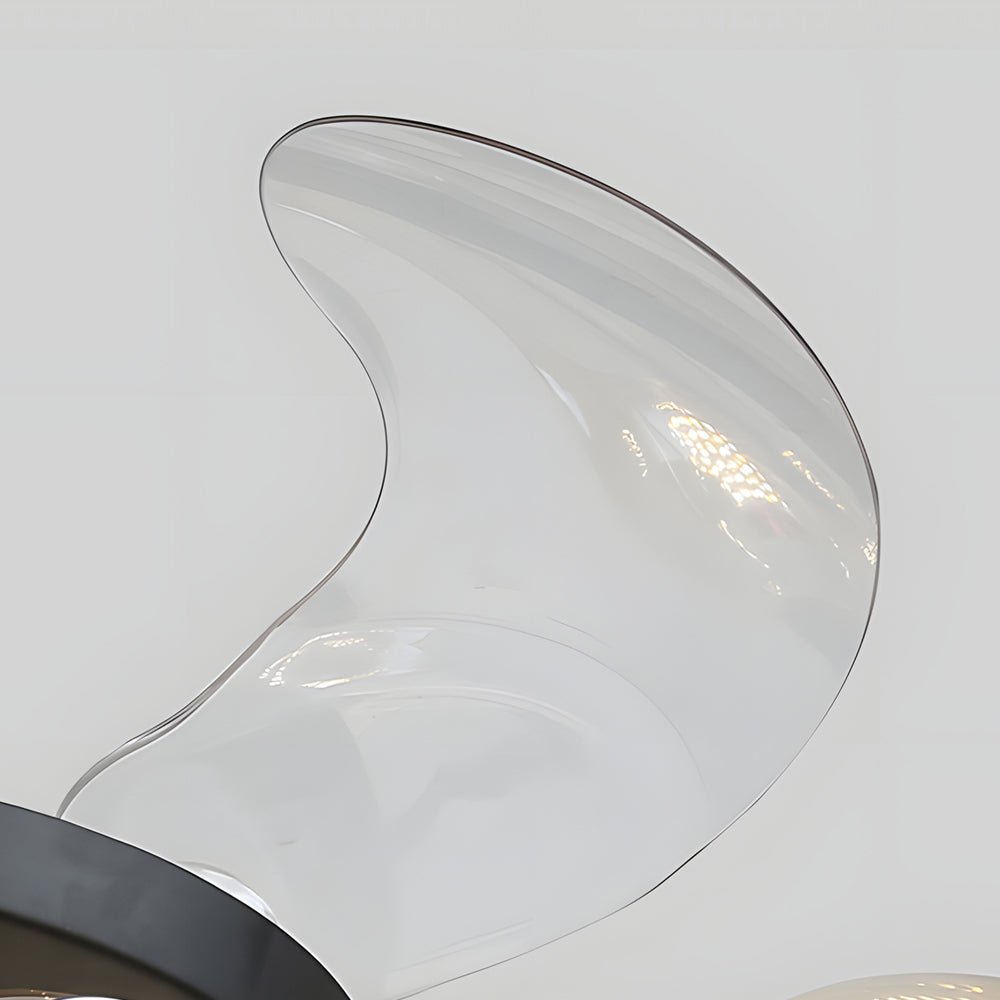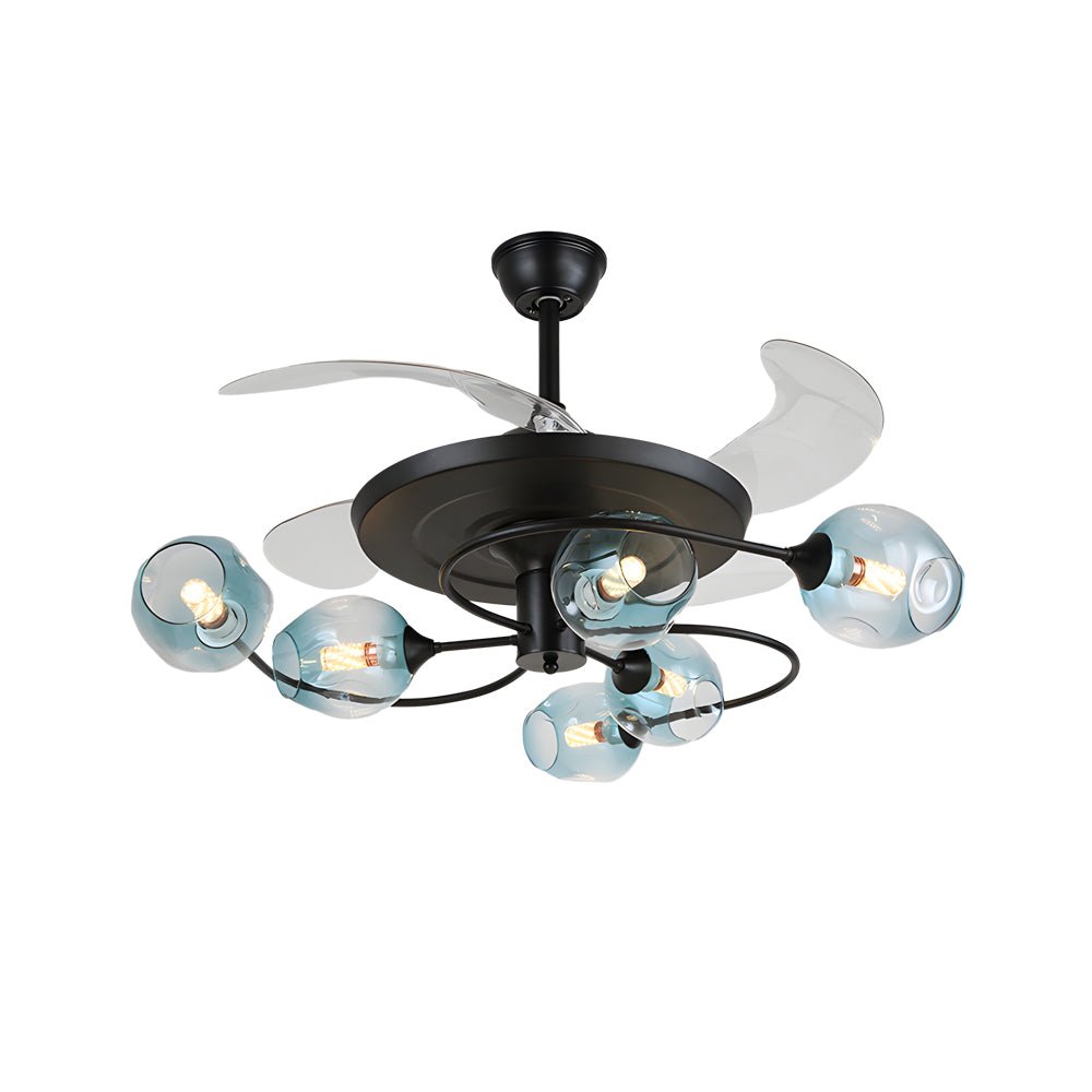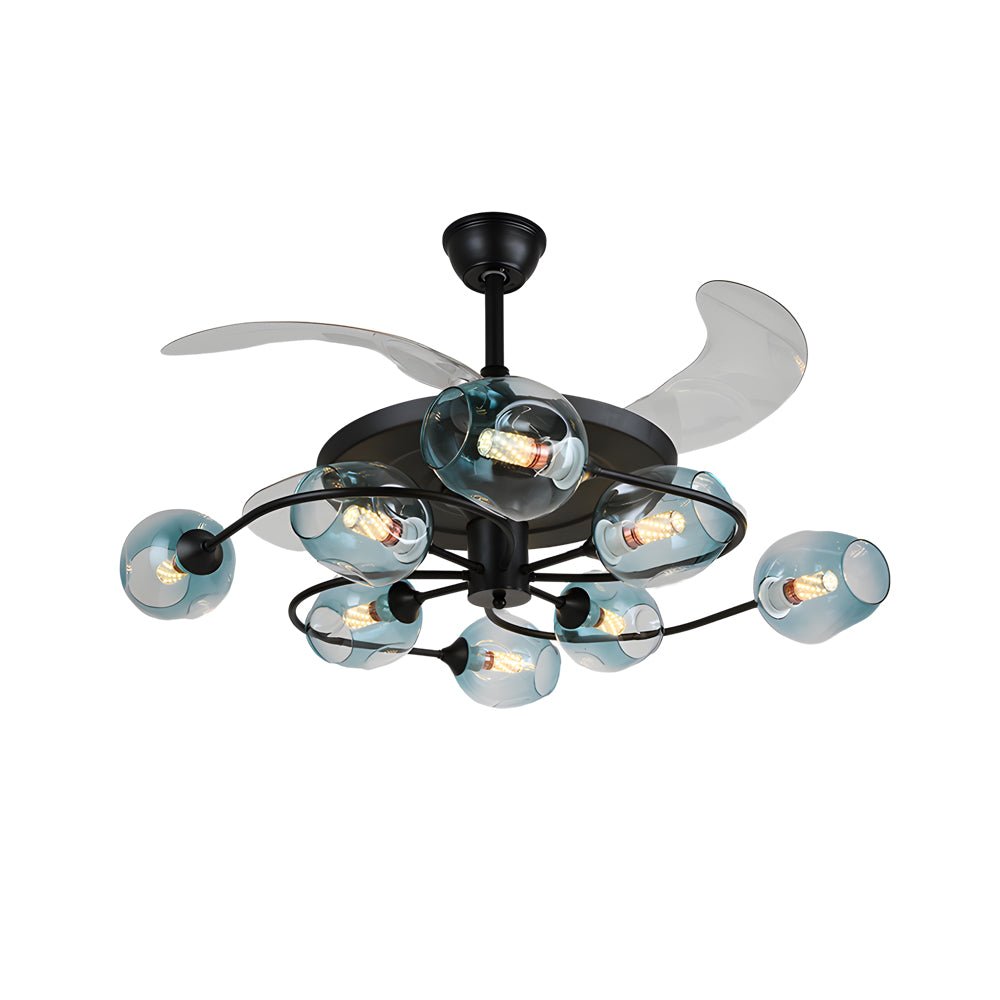 - This fixture combines modern and post-modern aesthetics, featuring 6 or 8 clear glass shades available in brown or blue hues. It includes 4 retractable fan blades, providing cooling functionality with an unobtrusive appearance when the fan is not in use.