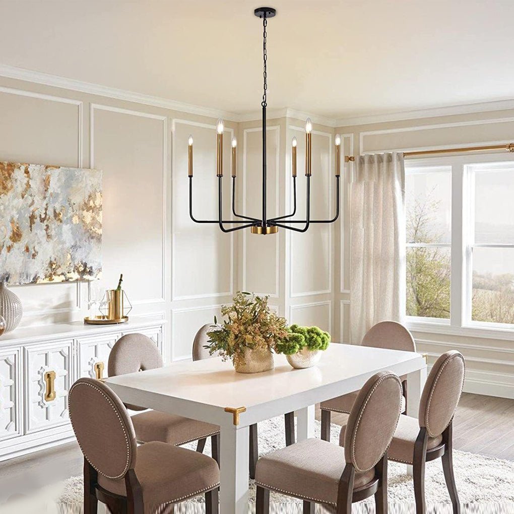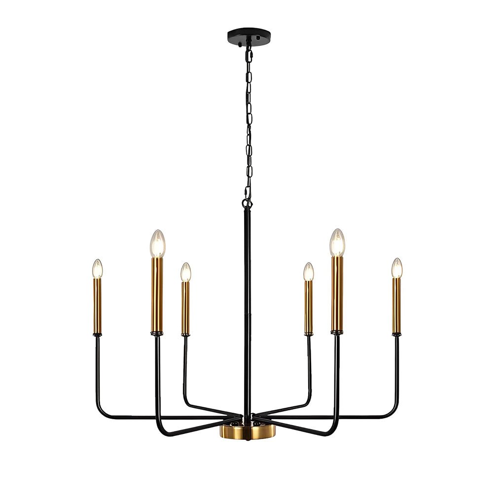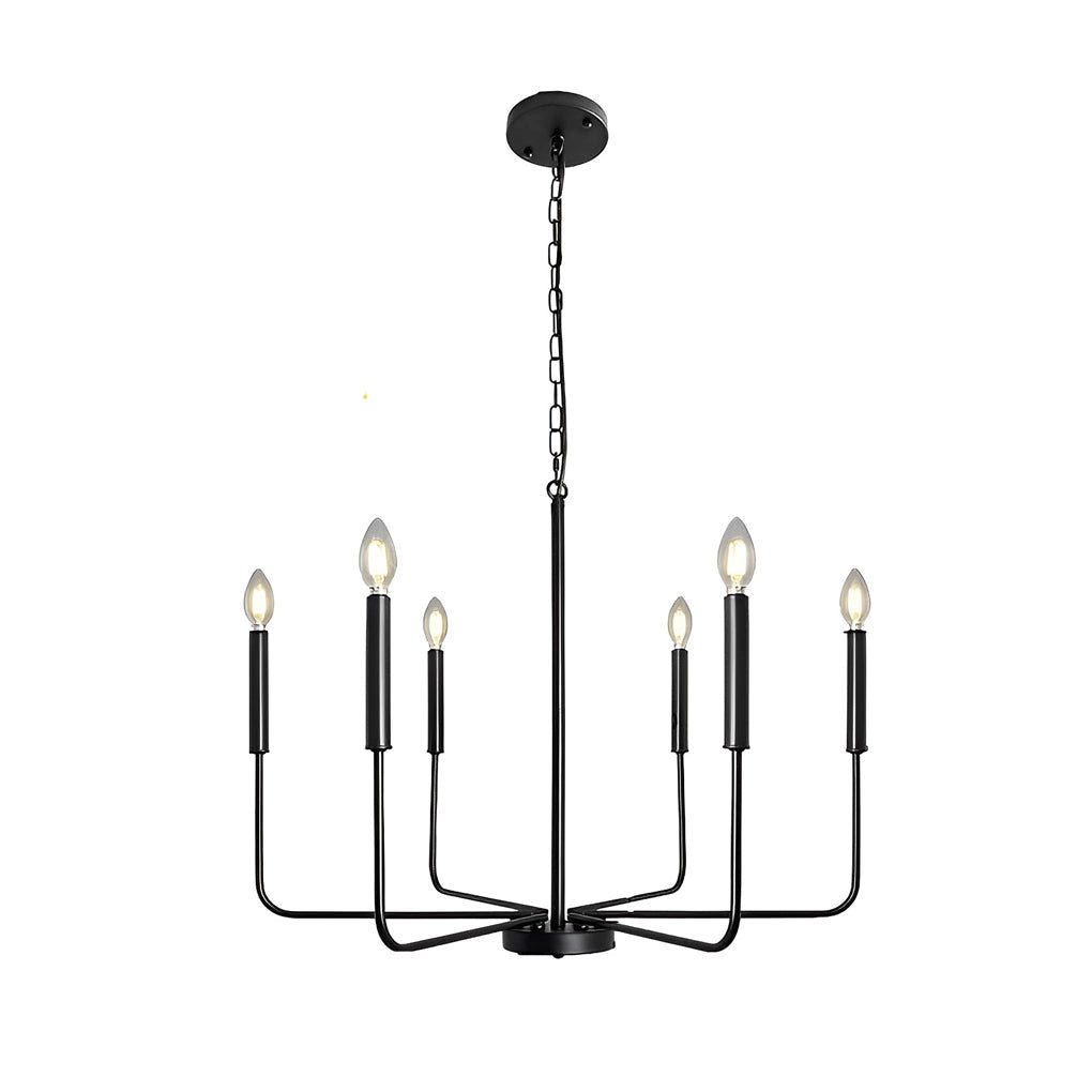 - This 6-light chandelier features a design with six classic iron candlestick rods, adding an elegant appeal to various spaces. It complements modern, farmhouse, and industrial interior styles.