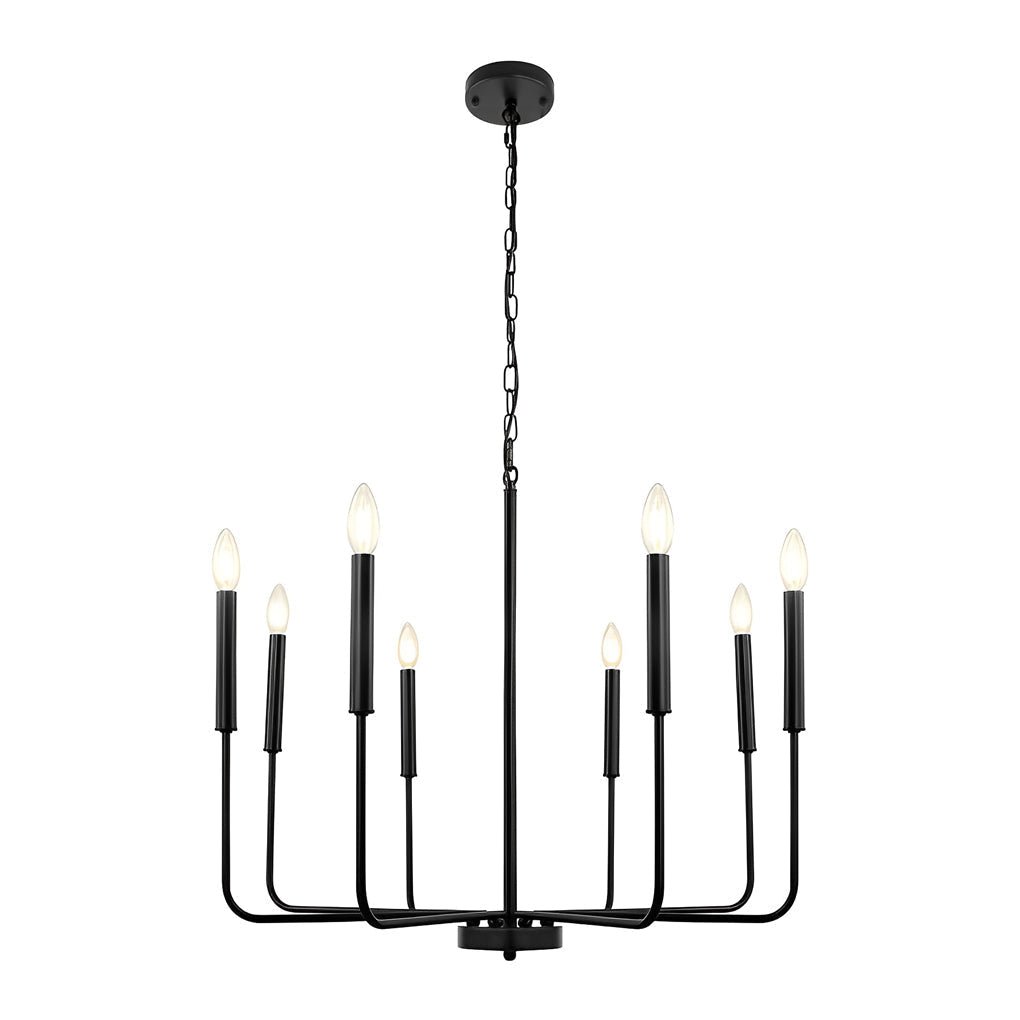 This chandelier features eight uniform candlestick stems, presenting a classic design with a retro industrial aesthetic. Its versatile style complements both modern and American country interior themes.
