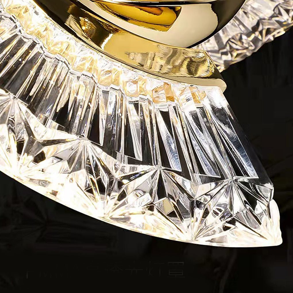 - This small chandelier features a construction of metal and acrylic, enhanced by electroplating for sturdiness and durability. The acrylic lampshade offers adjustable angles, allowing for versatile styling options.