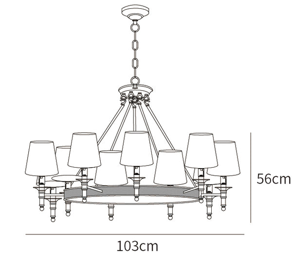 This chandelier features brass finishes, offering a modern interpretation of an industrial-inspired design. Its brass hoop pendant is available with 3, 5, 6, 8, or 10 bulb holders, each complemented by a natural linen lampshade. Designed to provide warm, diffused light, its chain-style suspension can be adjusted to perfectly suit your space.