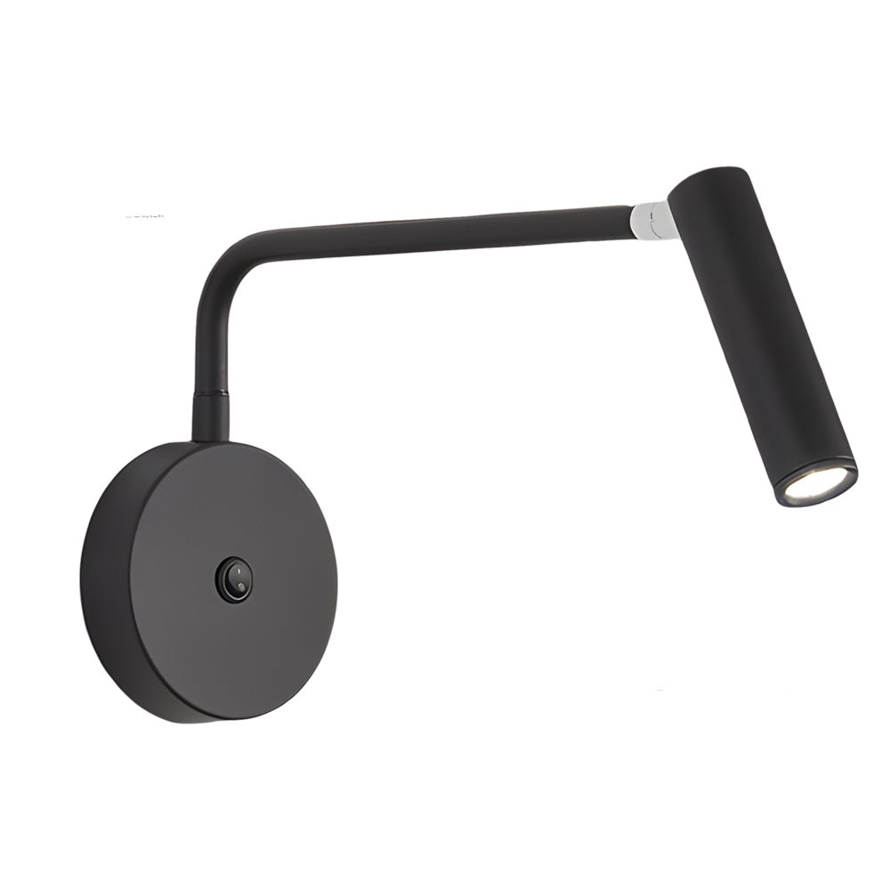 The adjustable spotlight head rotates horizontally and vertically, while the curved arm also articulates horizontally, allowing precise light direction. This adjustability makes it suitable for focused task lighting, such as bedside reading, or for ambient illumination in living areas. Operation is managed via a push-button switch located on the round wall-mounted panel.