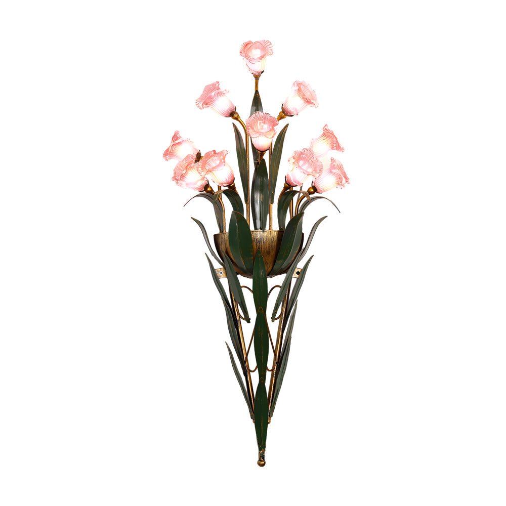 - Crafted from glass flowers and antique iron leaves, this wall sconce provides illumination for hallways, guest rooms, or study rooms.
