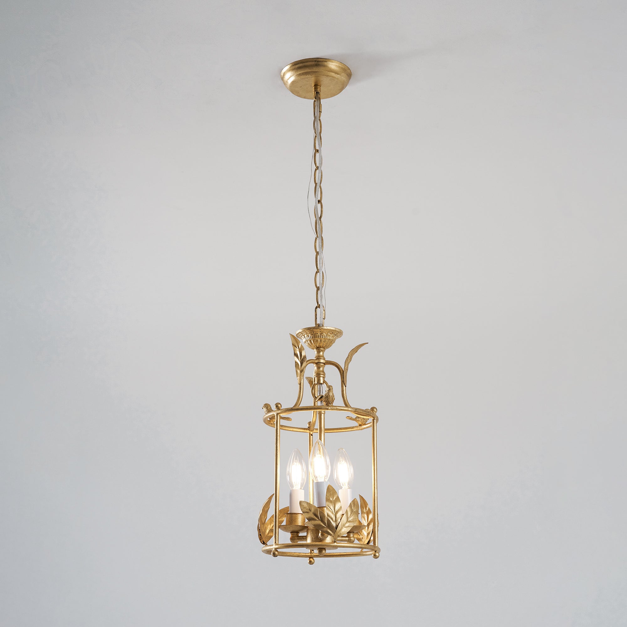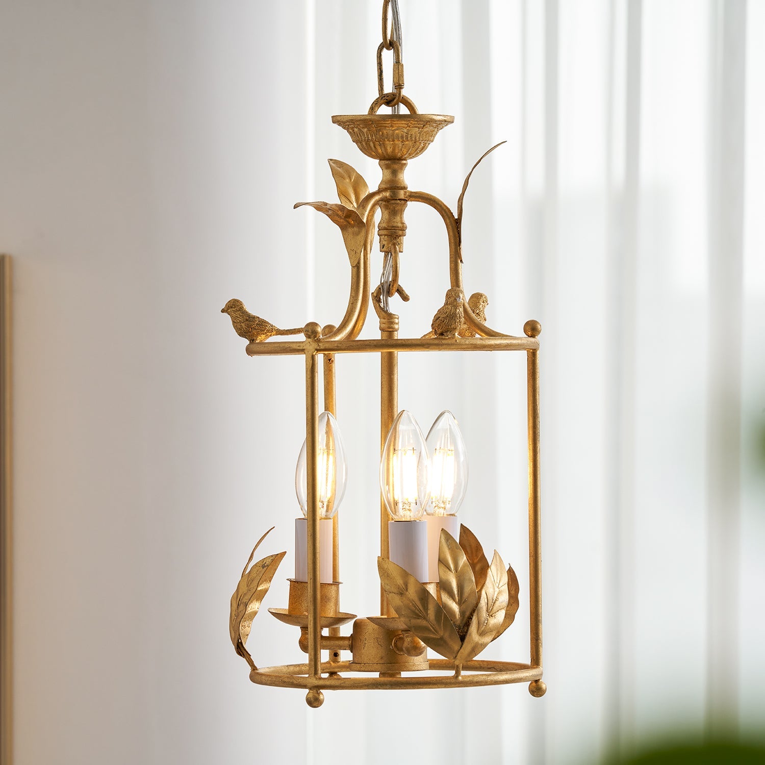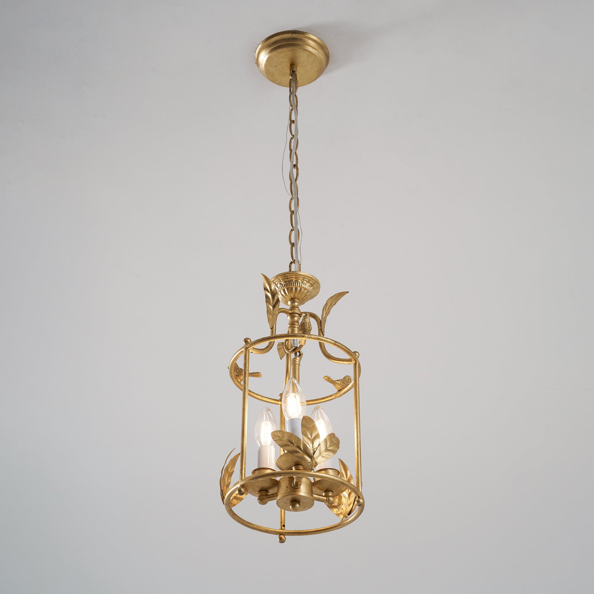 Add a touch of baroque style to your ceiling with the Brighton lantern pendant lamp. A chiseled circular canopy secures the fixture, with a short chain leading to a columnar lower rod that supports three surrounding candelabra lamps. The cylindrical frame descends, featuring intricate leaf-like detailing along the lower edge, while delicate birds perch at the upper edge, lending a refined, nature-inspired charm to the design.