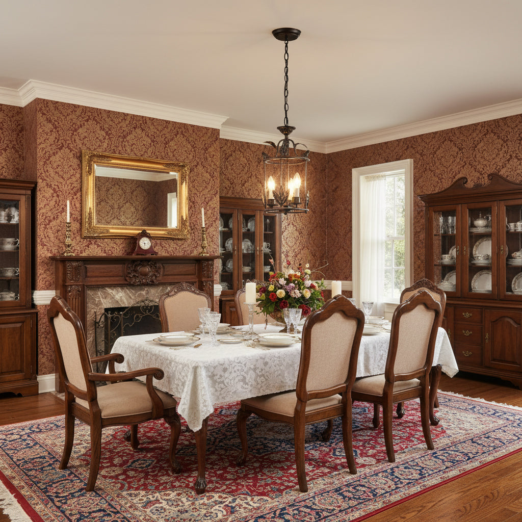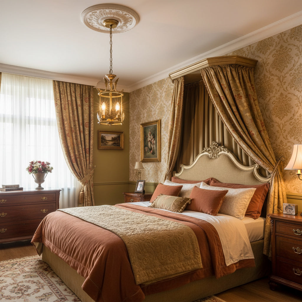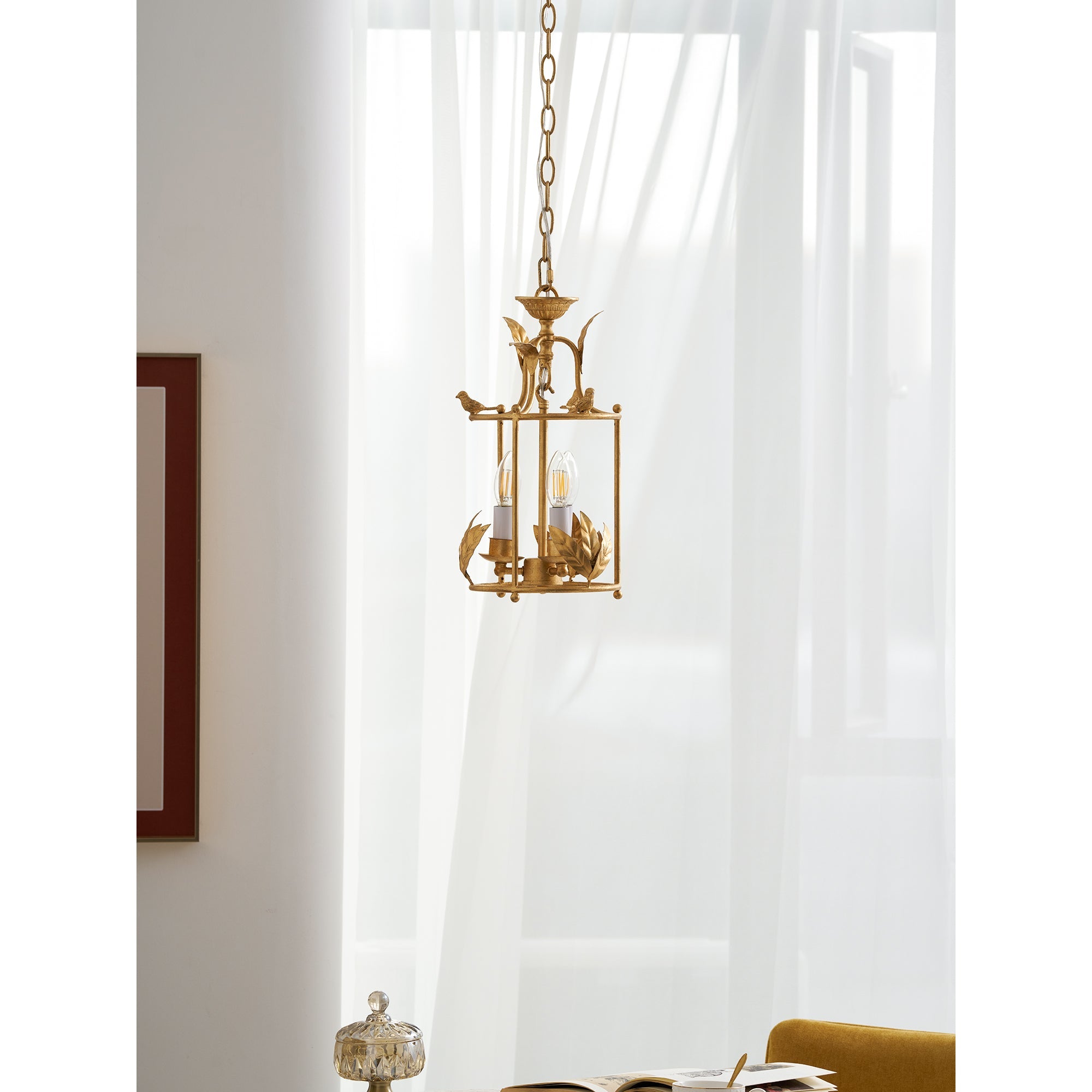 Add a touch of baroque style to your ceiling with the Brighton lantern pendant lamp. A chiseled circular canopy secures the fixture, with a short chain leading to a columnar lower rod that supports three surrounding candelabra lamps. The cylindrical frame descends, featuring intricate leaf-like detailing along the lower edge, while delicate birds perch at the upper edge, lending a refined, nature-inspired charm to the design.