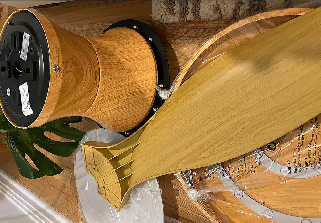Product Details: This unit is powered by a high-performance DC motor and includes a standard hanging rod system. Please note that slight color variations may be present in the fan blades and body due to natural material finishes and craftsmanship.