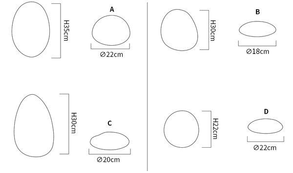 Model A: ⌀ 8.6″ x H 13.7″ / Dia 22cm x H 35cm, Model B: ⌀ 7.1″ x H 11.8″ / Dia 18cm x H 30cm, Model C: ⌀ 7.8″ x H 11.8″ / Dia 20cm x H 30cm, Model D: ⌀ 8.6″ x H 8.6″ / Dia 22cm x H 22cm