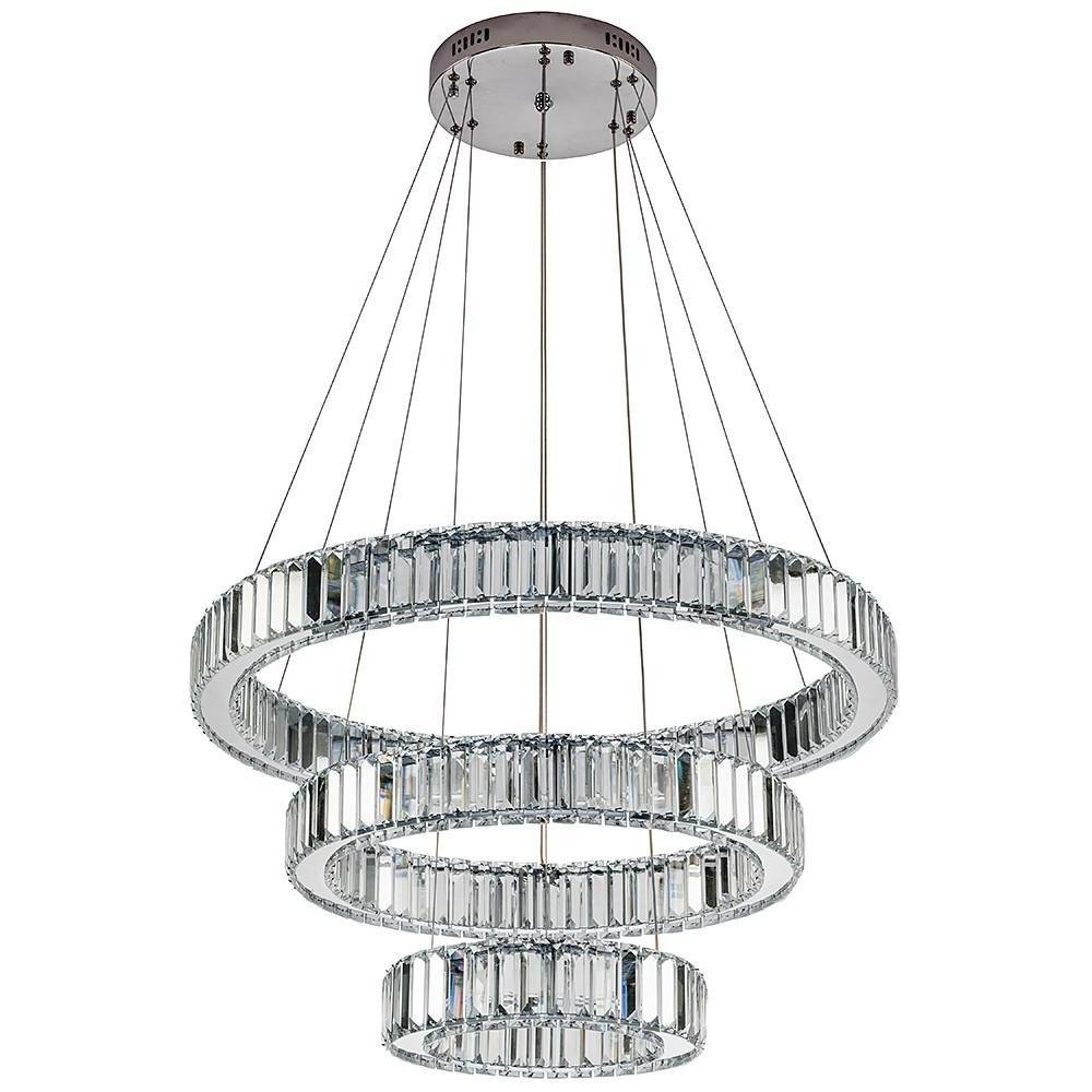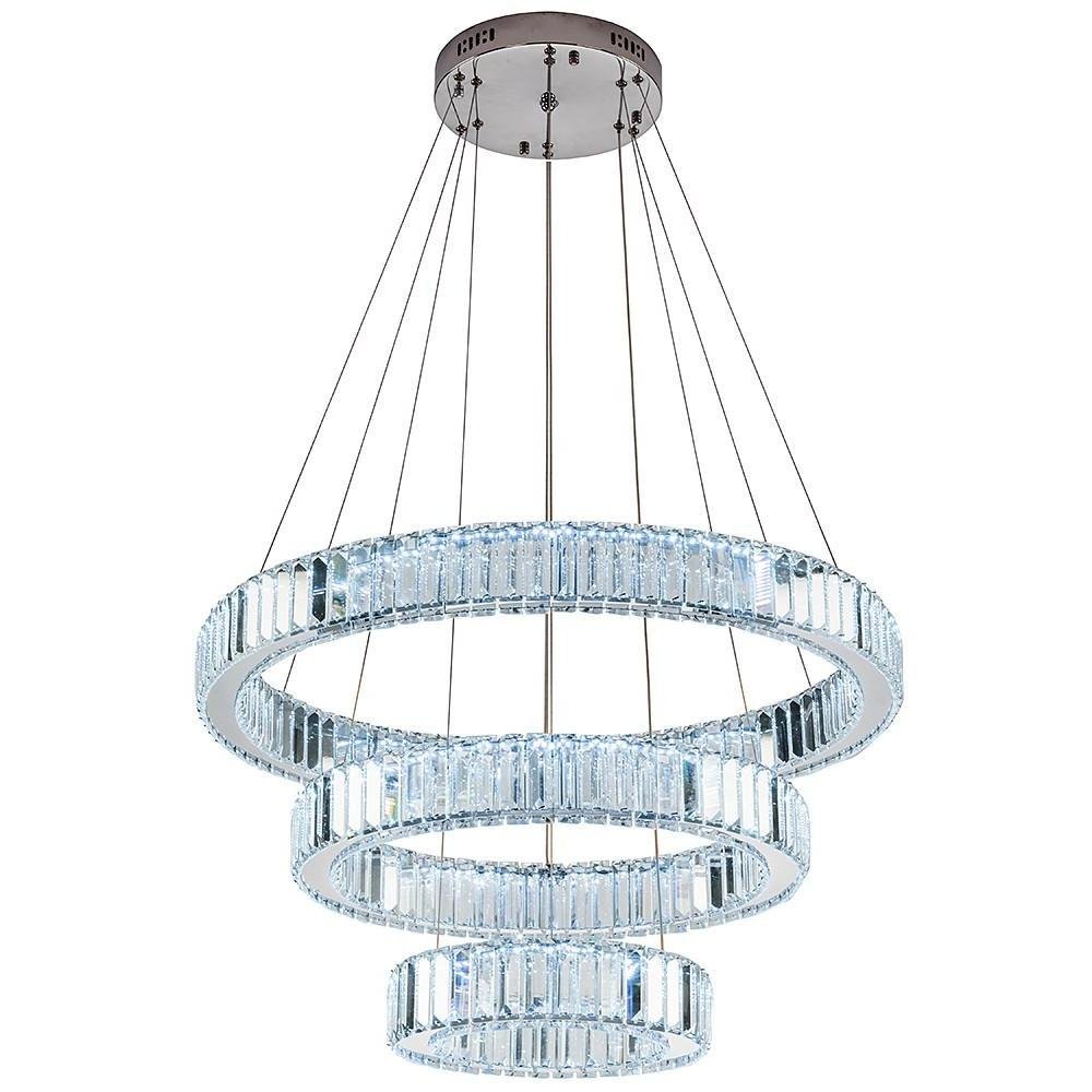- This pendant light features a three-tier ring design, crafted from metal and crystal. The design refracts light, creating a brilliant display. It is available with a polished chrome finish, suitable for various decor styles. This fixture is designed to illuminate living rooms, bedrooms, or dining areas, contributing to an elegant and refined atmosphere.
