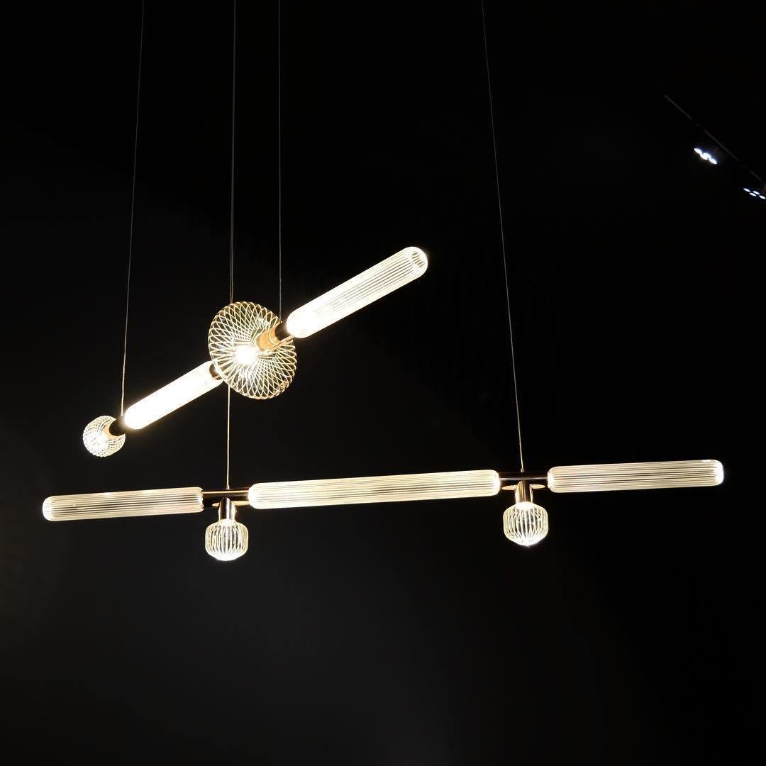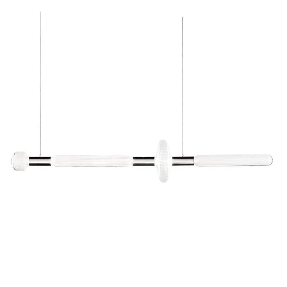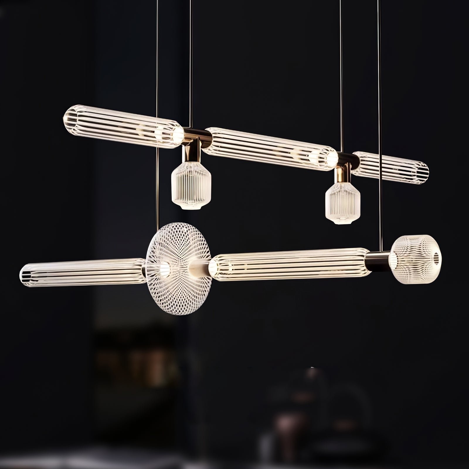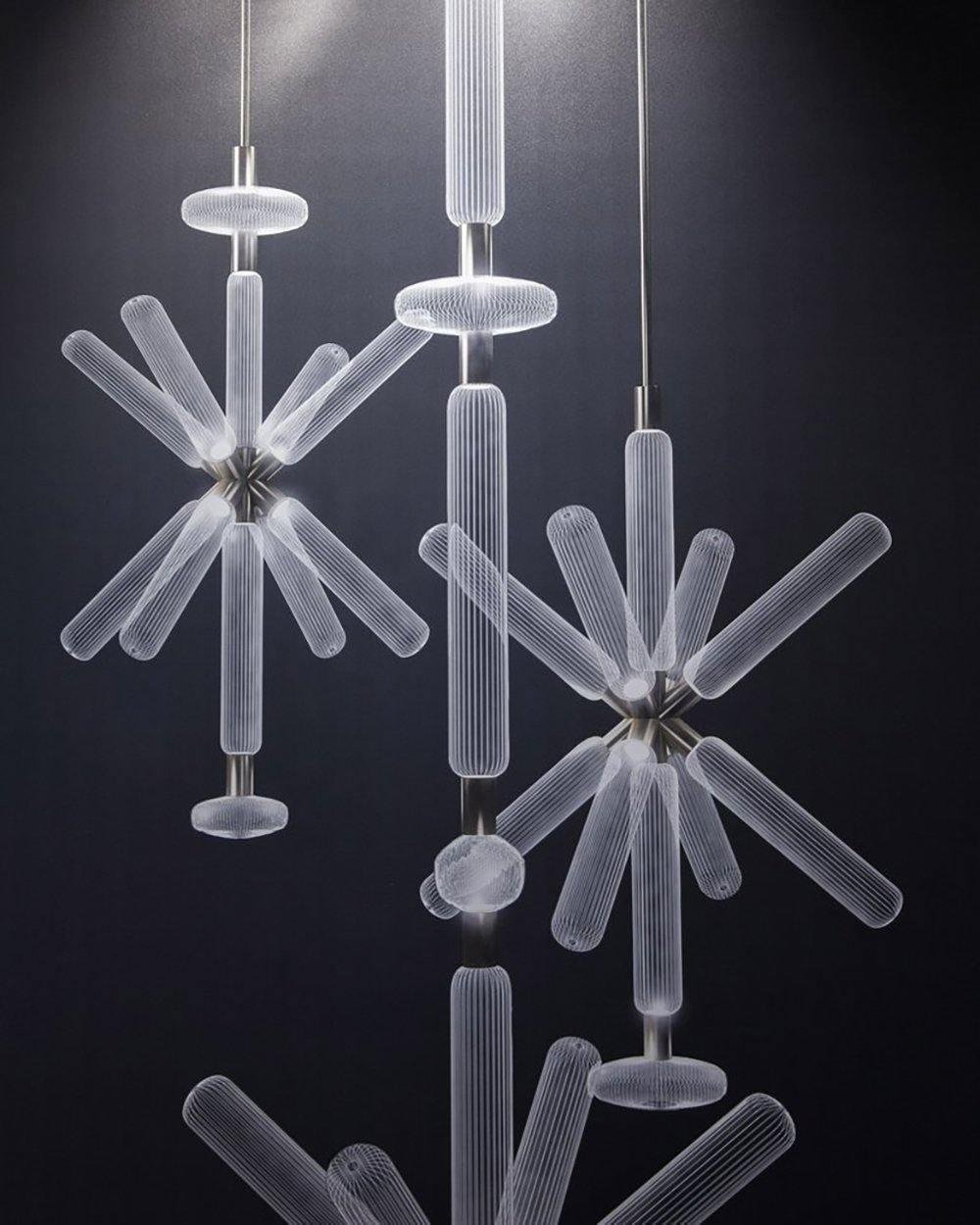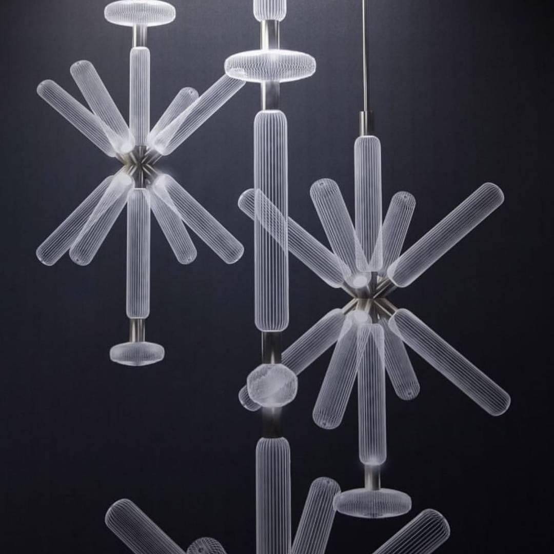 The Cipher collection blends heritage techniques with contemporary design. It features delicate hand-blown crystal cylindrical pieces with clean, clear lines. Light emanates subtly from hidden sources at the connection points, creating a soft, ambient effect.