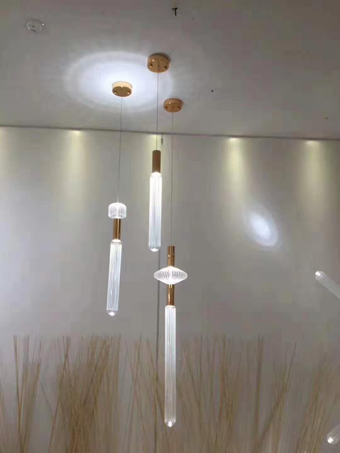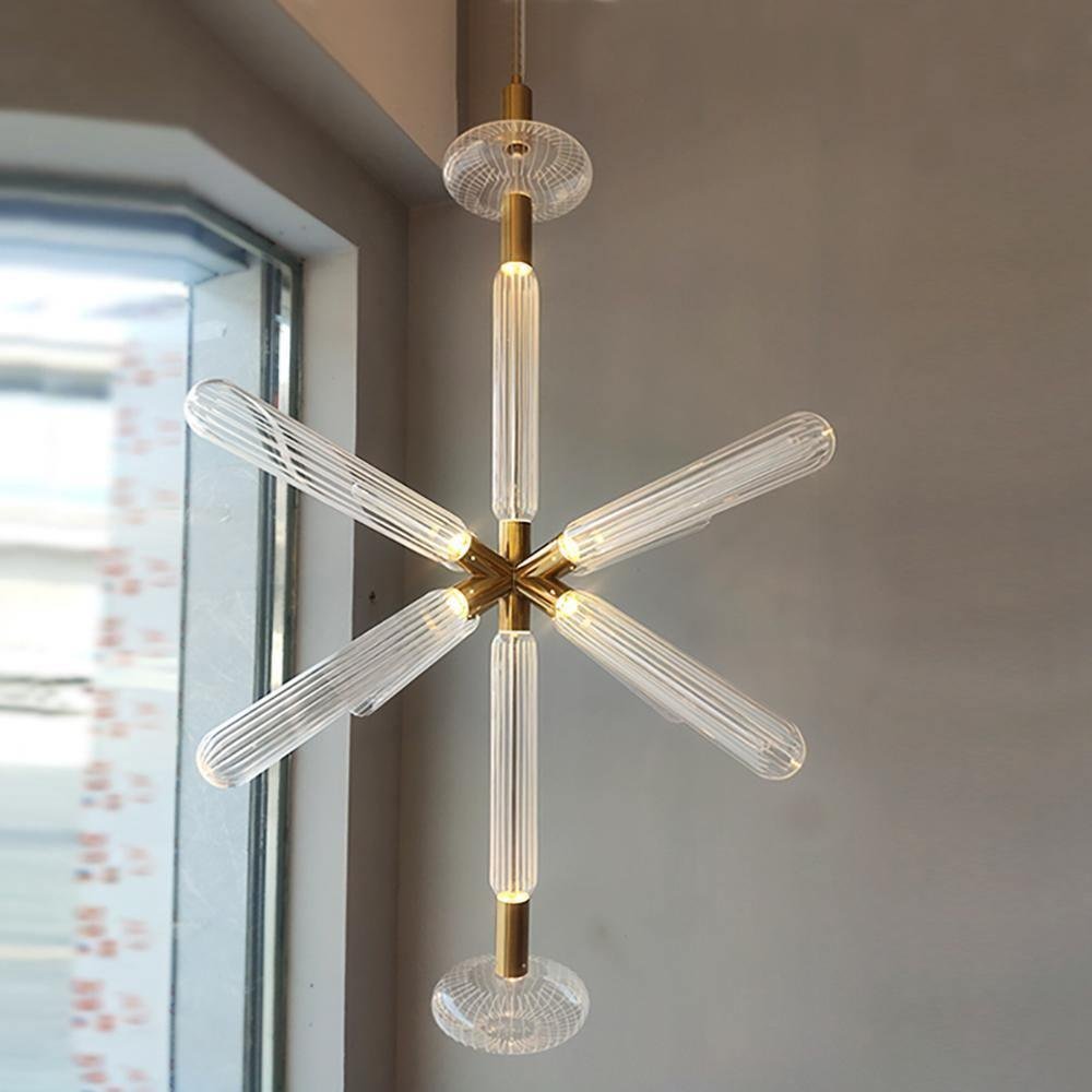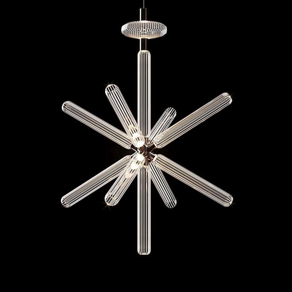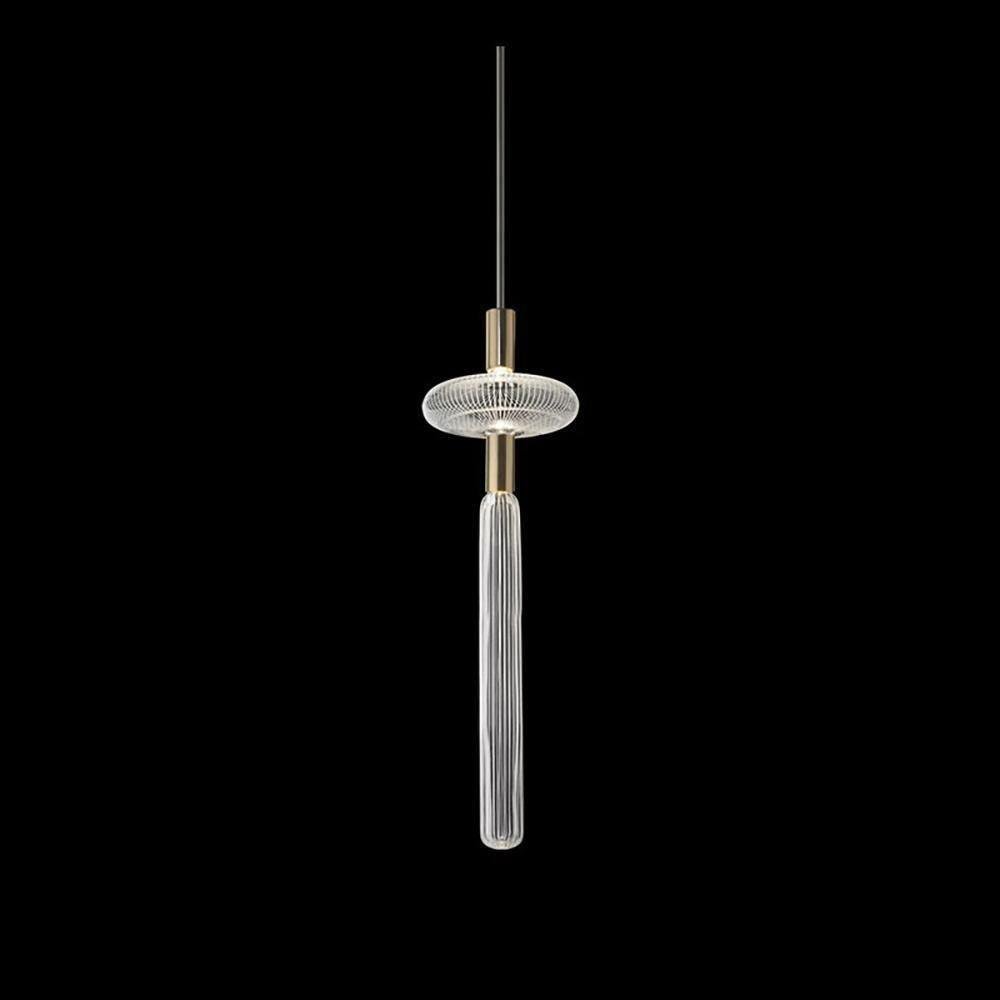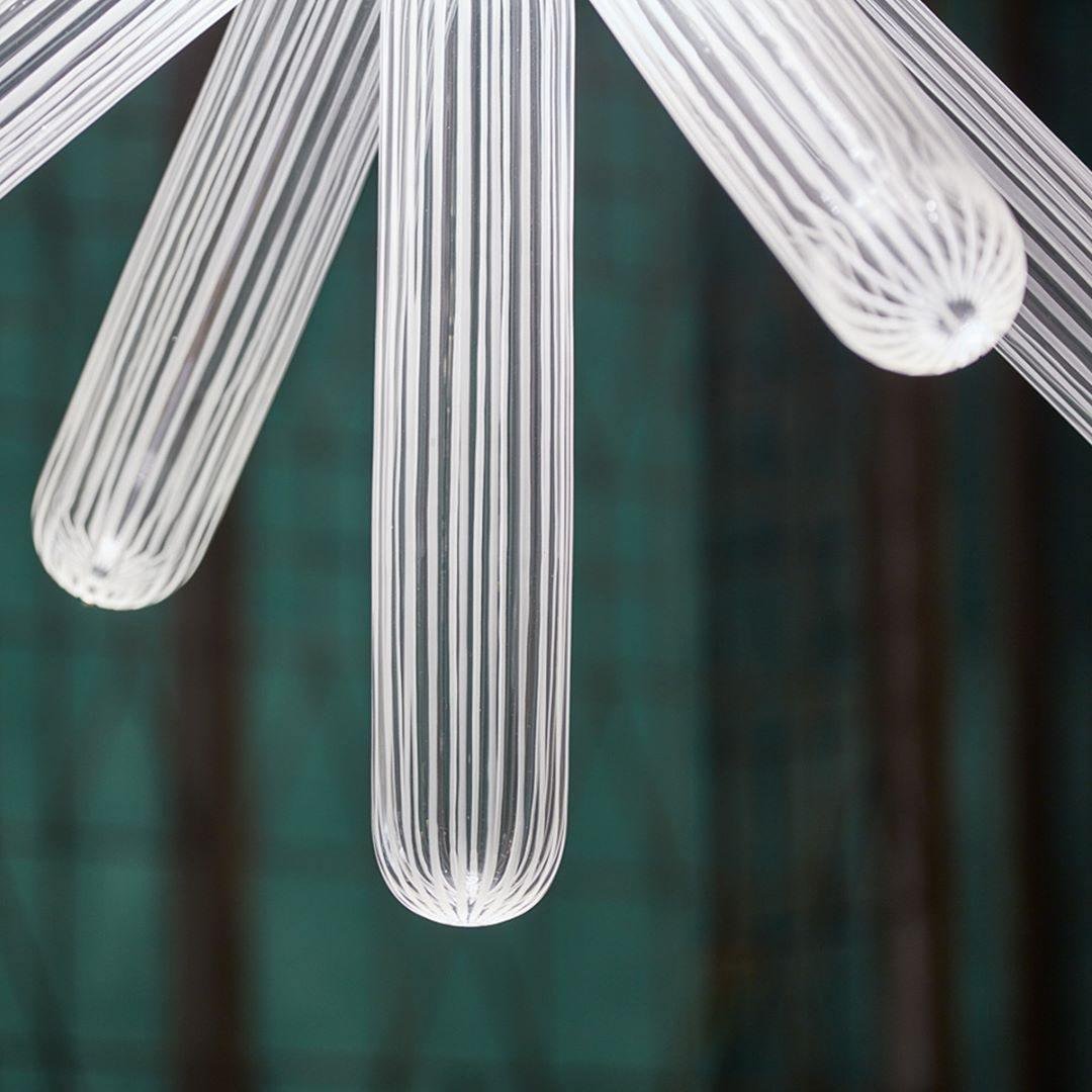 The Cipher collection blends heritage techniques with contemporary design. It features delicate hand-blown crystal cylindrical pieces with clean, clear lines. Light emanates subtly from hidden sources at the connection points, creating a soft, ambient effect.