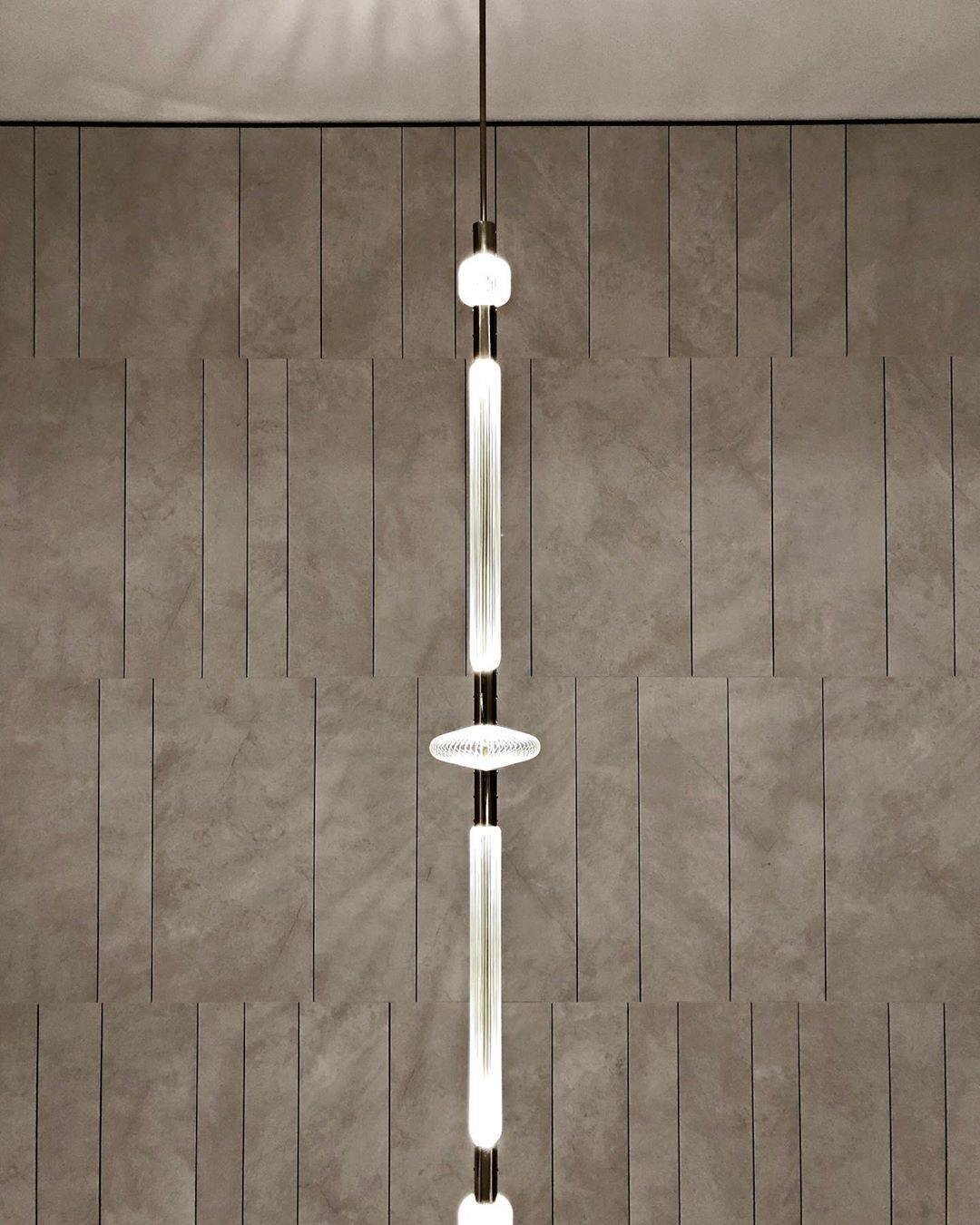Components are arranged in series and joined by polished champagne-gold finished connections, creating a linear form that offers a unique visual rhythm. The Cipher collection is highly flexible and customizable, allowing for various configurations suitable for private residences and bespoke installation projects.