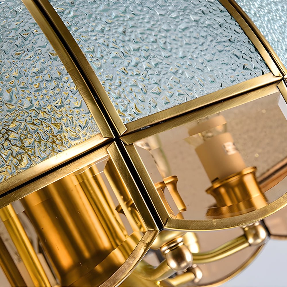 This European-style chandelier features a sophisticated design crafted from copper and glass. Its distinctive curved frosted glass lampshade offers a unique visual appeal, creating a warm and inviting atmosphere.