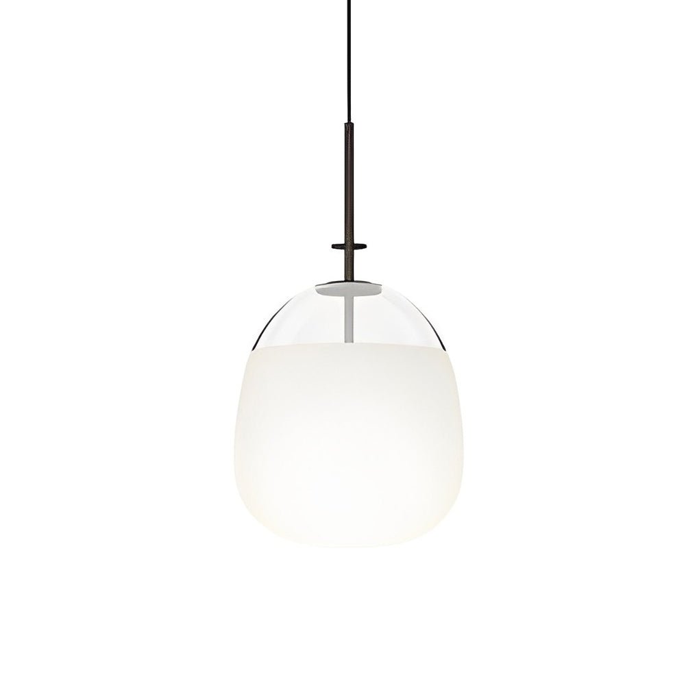 This modern glass pendant light is available in three distinct shapes. The light diffuses through the glass lampshade, emitting a warm glow that creates an inviting atmosphere. This fixture functions both as a lighting element and a decorative art piece.