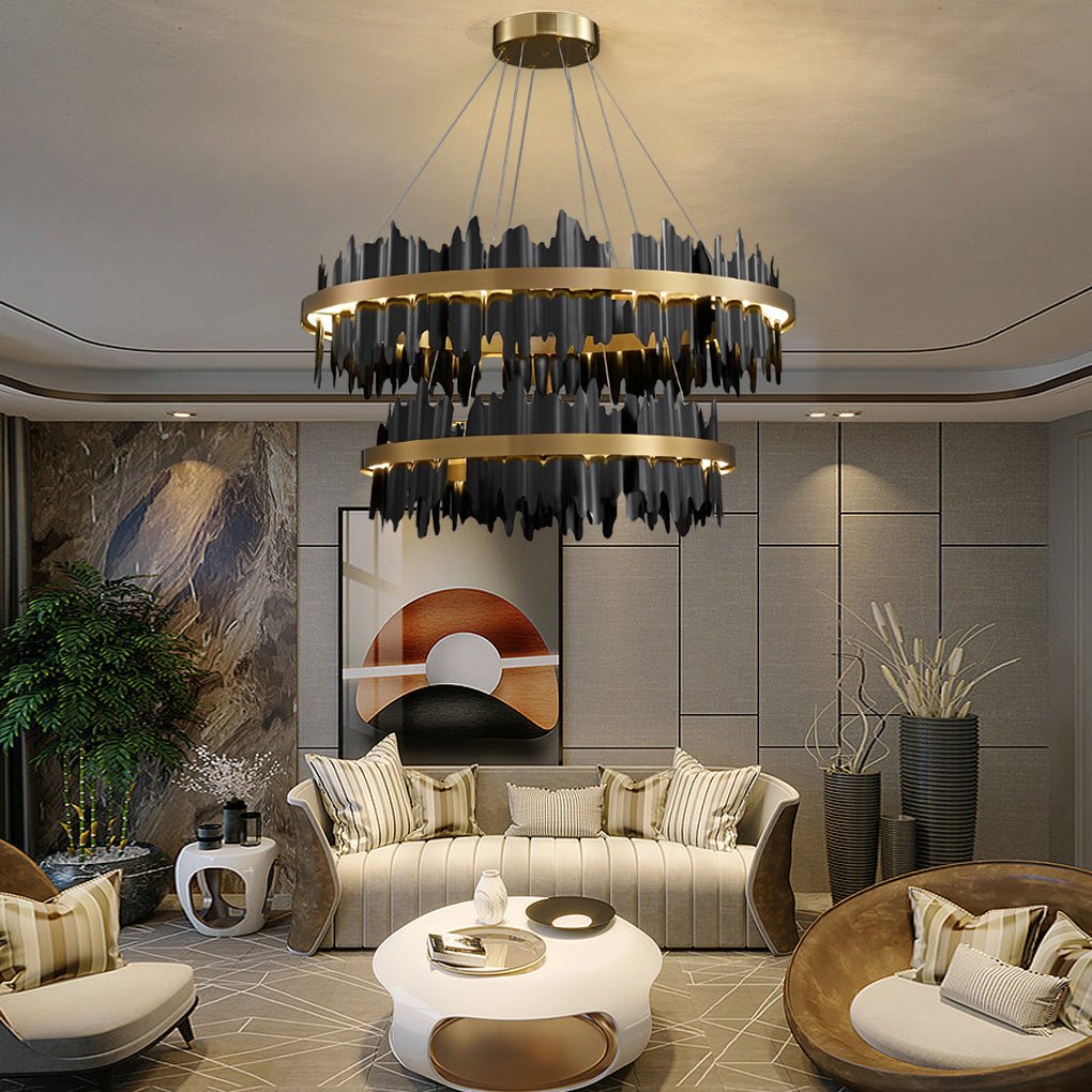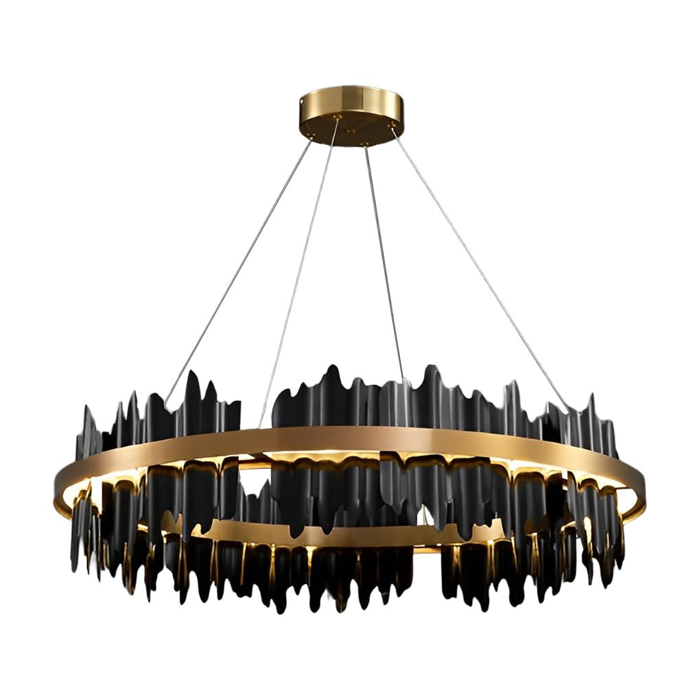 - This chandelier features artistic shapes and a textured metal body. A contemporary gold finish accents the circular design.