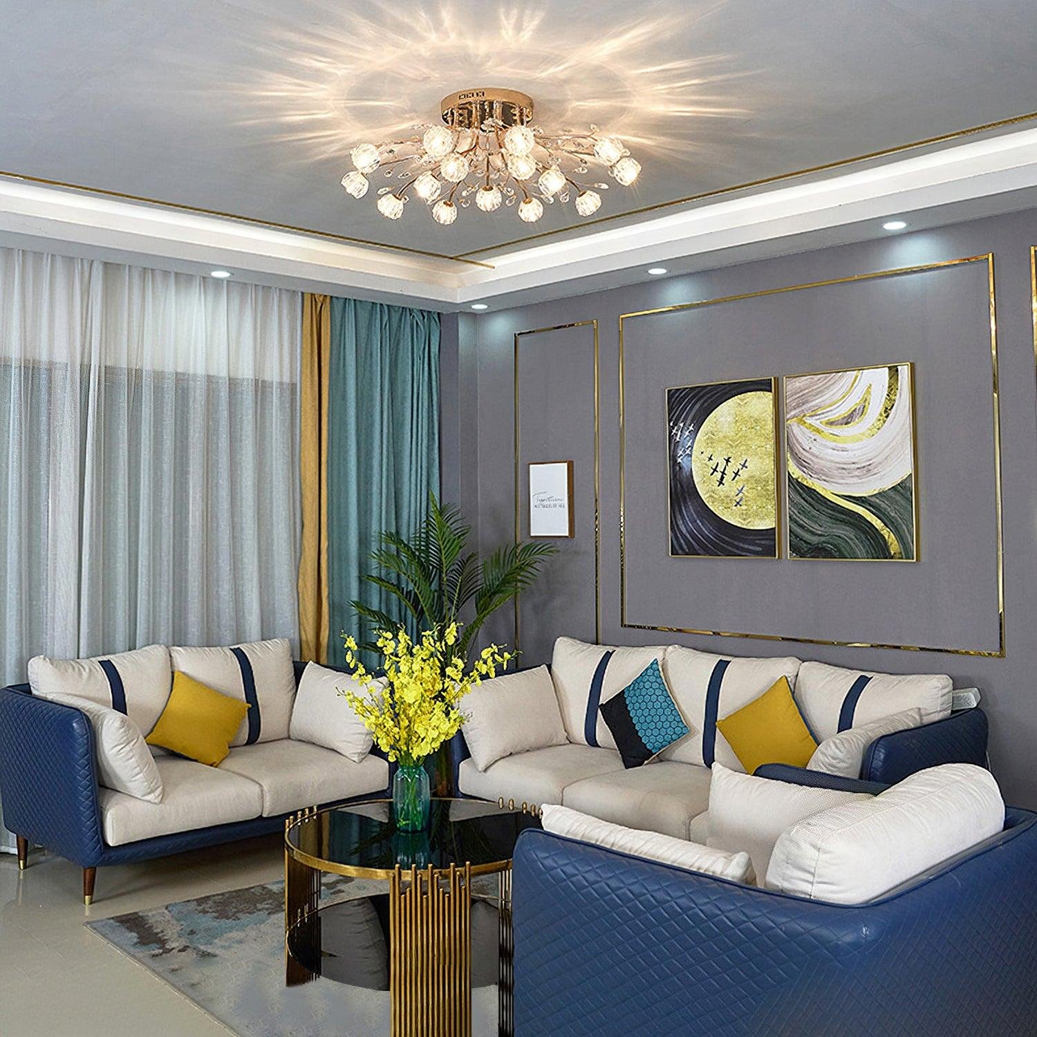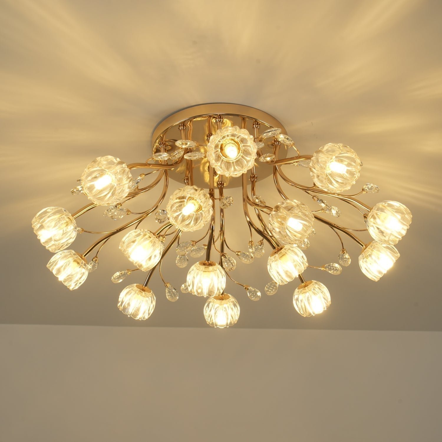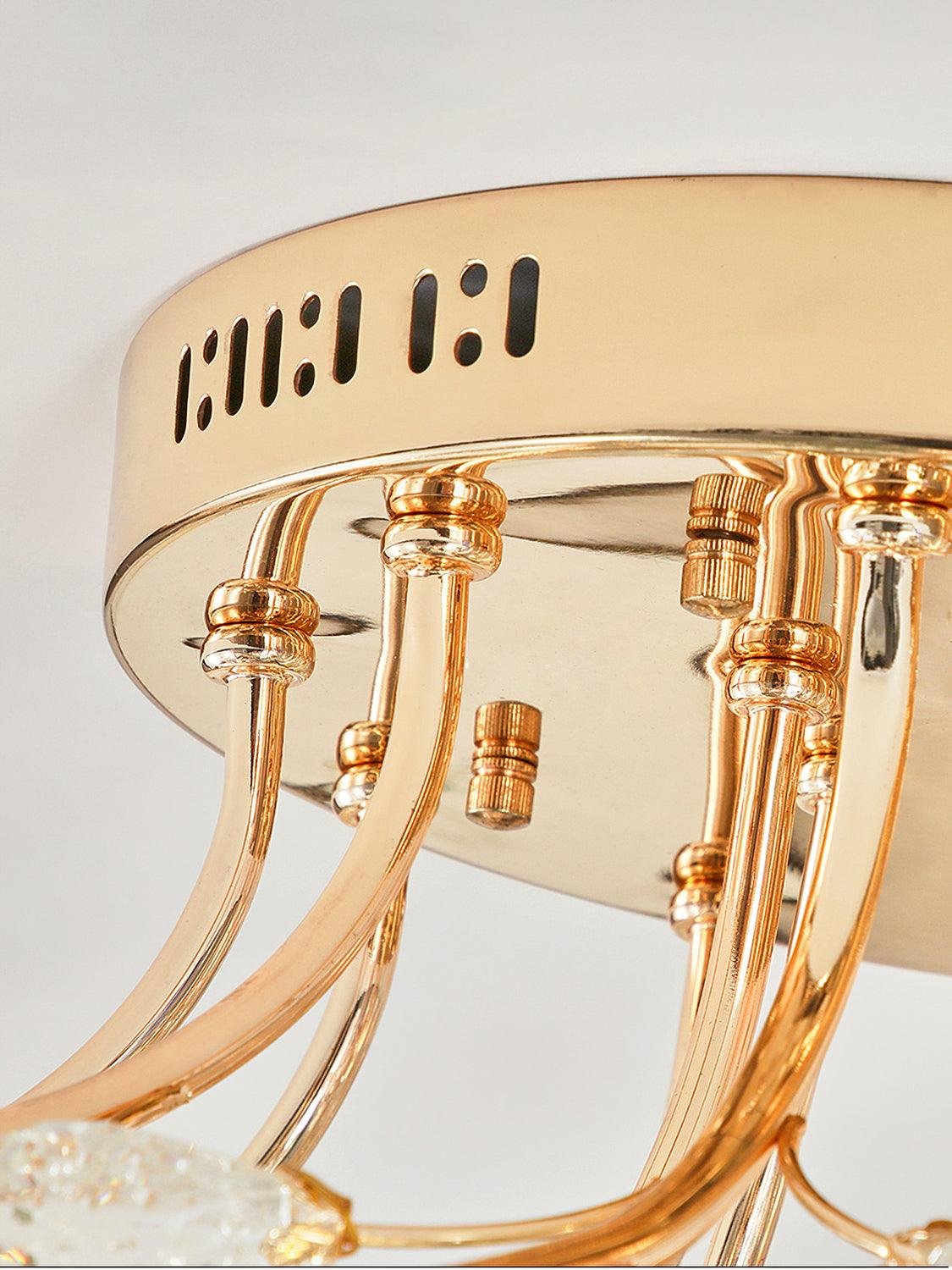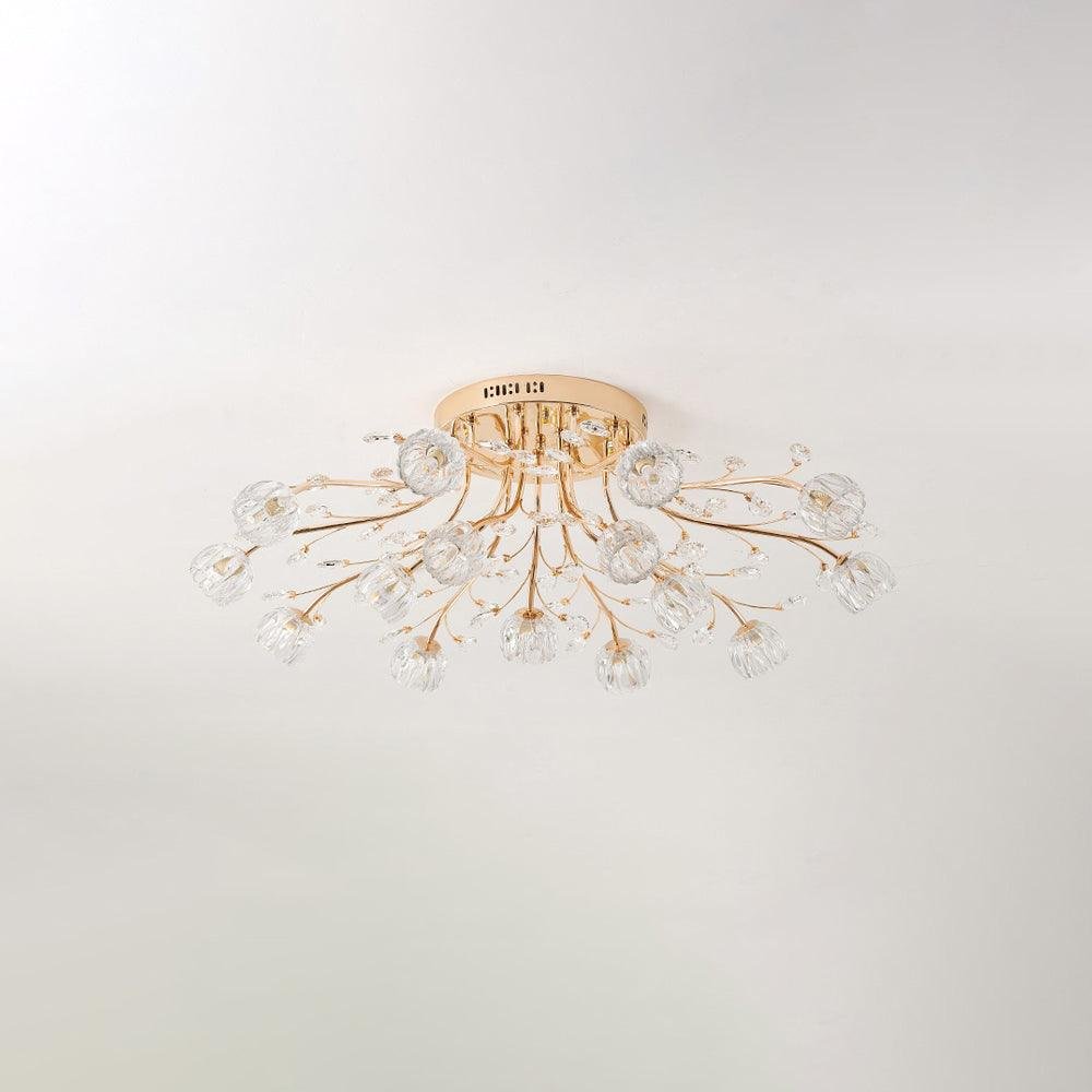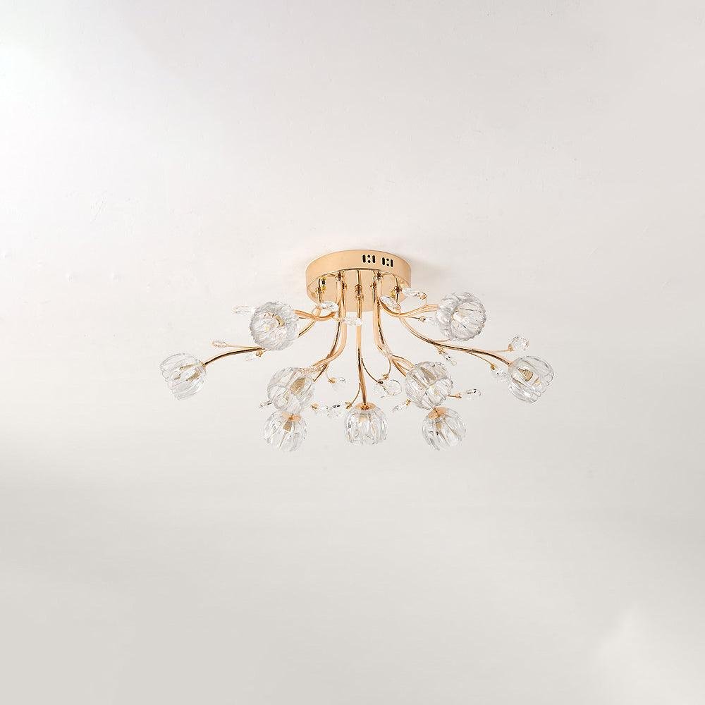 The Crystal Flower Ceiling Light is a ceiling lighting fixture crafted from crystal, complemented by a copper lamp body and a transparent lampshade.