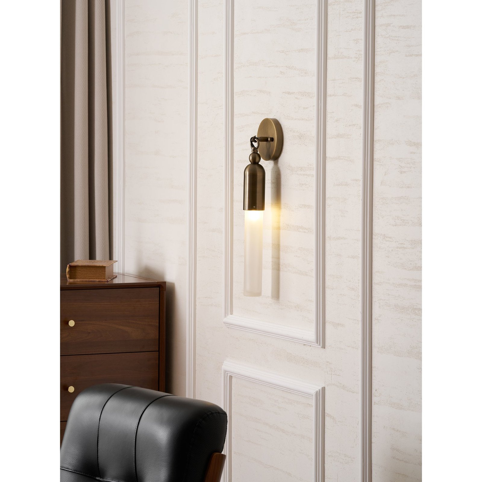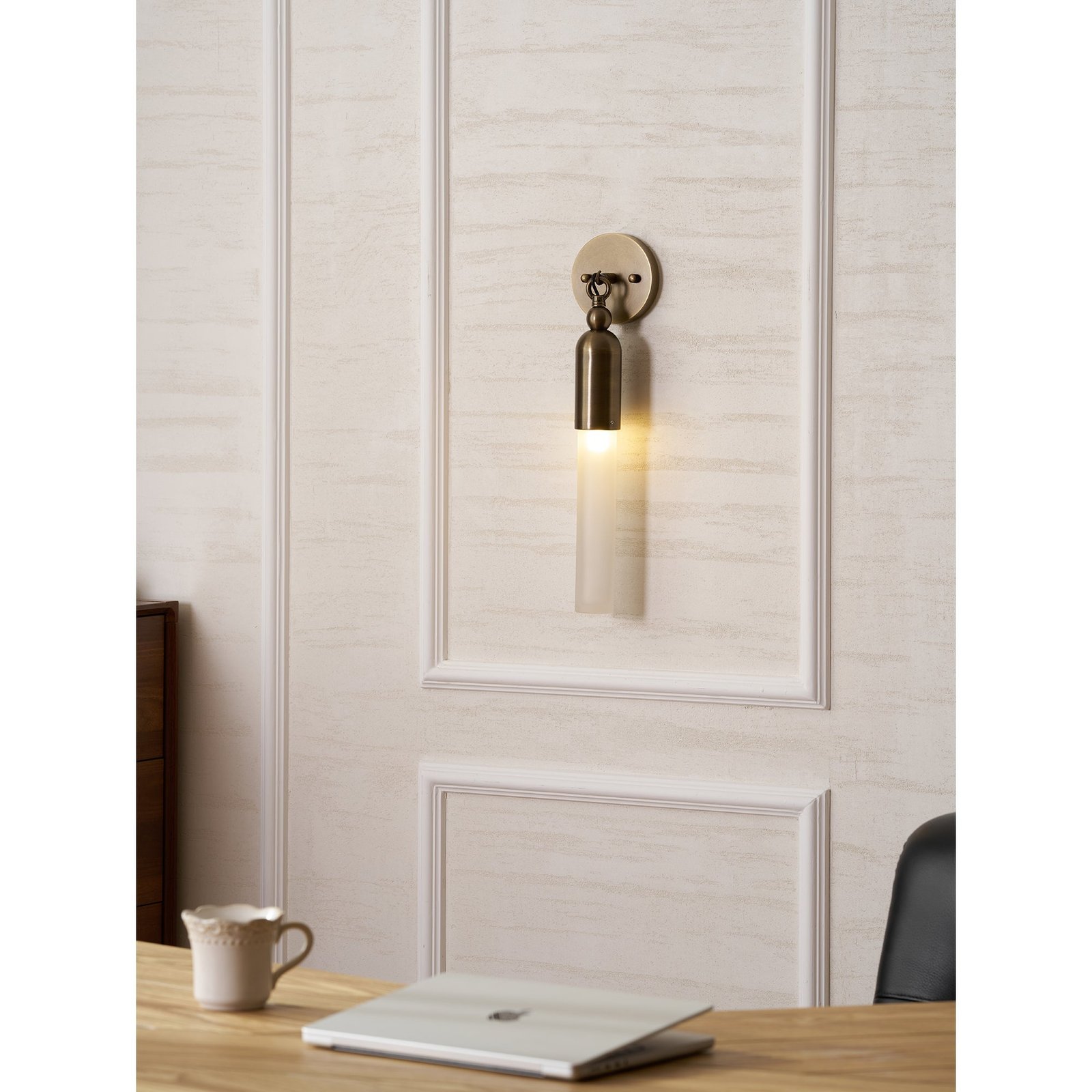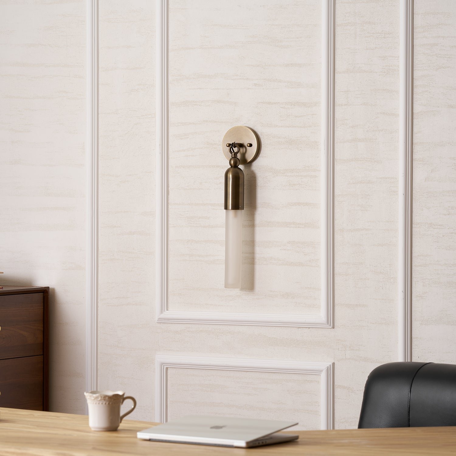 The Darby Wall Lamp reimagines classic decorative design with a modern touch. Its brass dome subtly diffuses light, which is enriched by textured mold-blown glass cylinders, producing a warm, inviting ambiance. This elegant fixture adds refined warmth and timeless charm to any space.