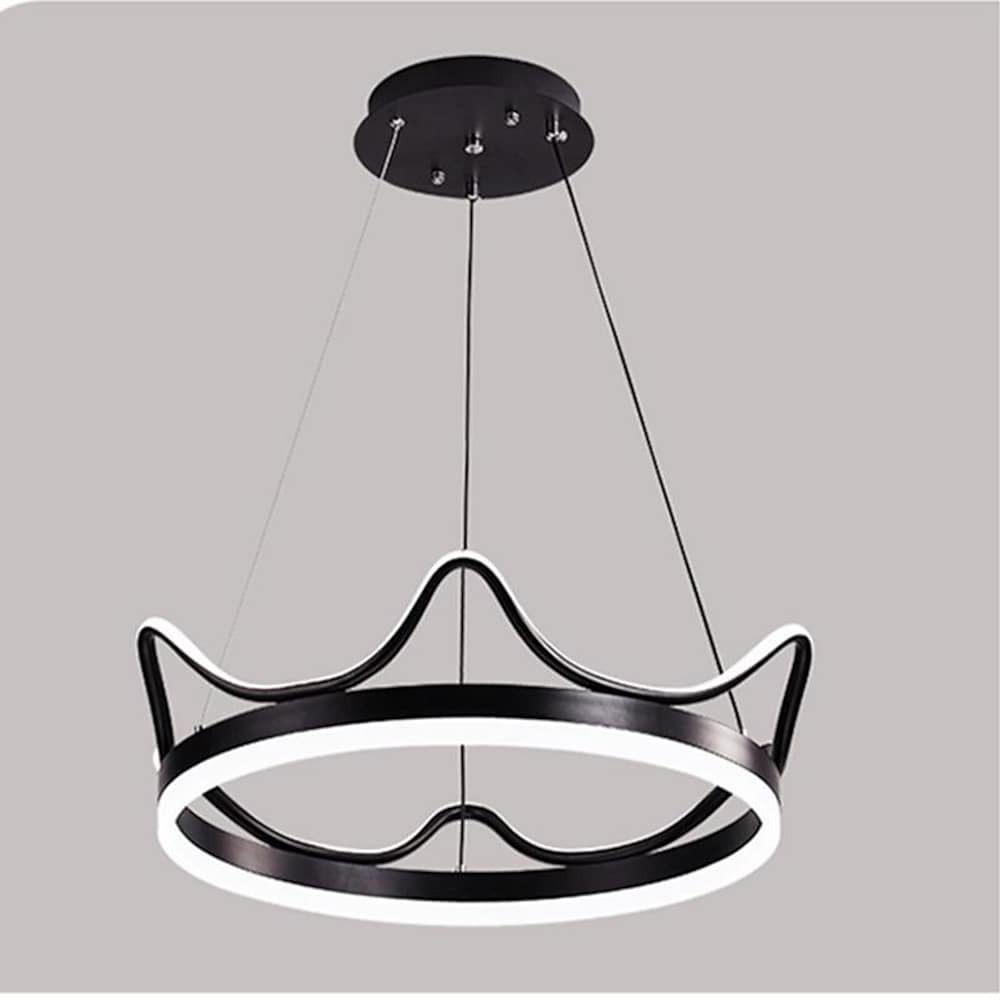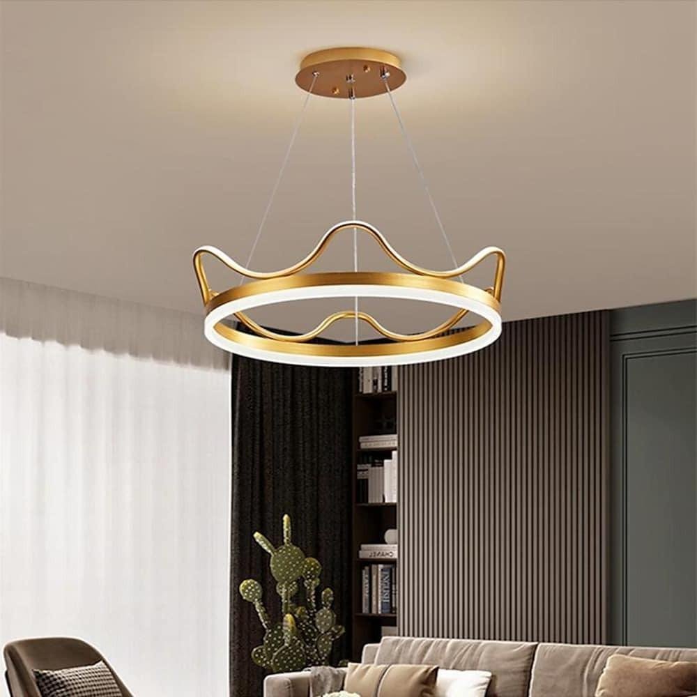 This modern round LED ring chandelier pendant light combines contemporary design with practical illumination. Crafted with a premium aluminum frame and high-transmittance acrylic lampshade, it provides effective light diffusion, fostering a warm and inviting atmosphere. The crown design adds a refined aesthetic suitable for living rooms, dining rooms, or kitchens.