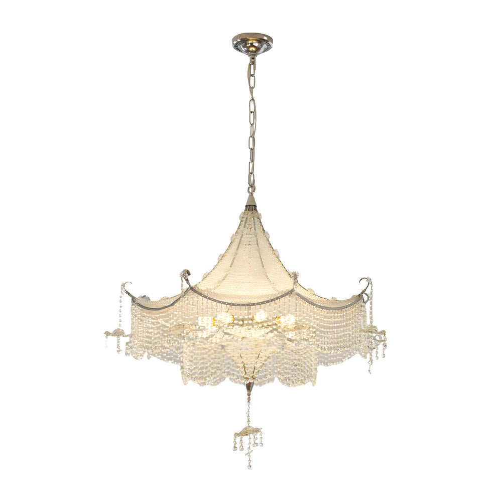 - This chandelier is crafted with an electroplated chrome metal body and decorated with cascading crystal fringes. Its design draws inspiration from a pagoda, distinguishing it among crystal light fixtures.