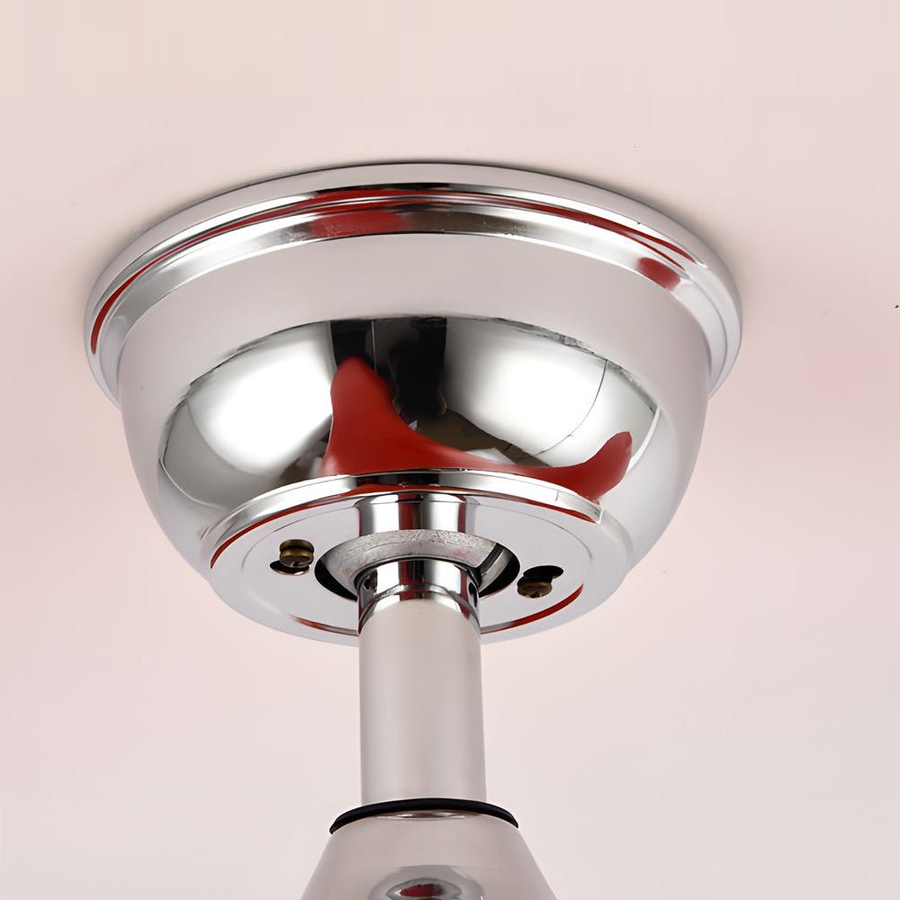 A white acrylic shade diffuses the built-in LED light source, which offers three color temperatures (3000K, 4500K, and 6000K). The reversible DC motor is controlled by an included remote, allowing selection from six wind speeds. Its reversible function provides a forward mode for cooling and a reverse mode for air circulation.