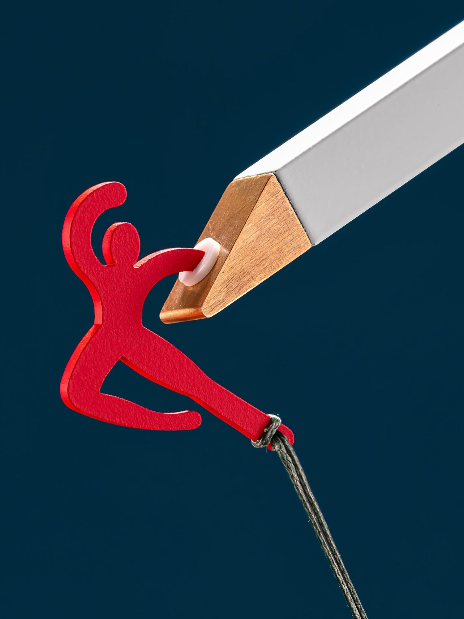 The Ettorino Floor Lamp presents a combination of primary colors with an innovative design. A notable element is the functional detail featuring a red dancing figure shape. This lamp is engineered to provide adjustable and rotatable illumination, suitable for various work surfaces and general lighting needs.