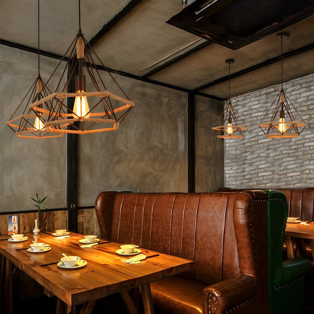 - This geometric pendant lamp offers a retro rustic aesthetic for home decor, featuring a black exterior and geometric design.
