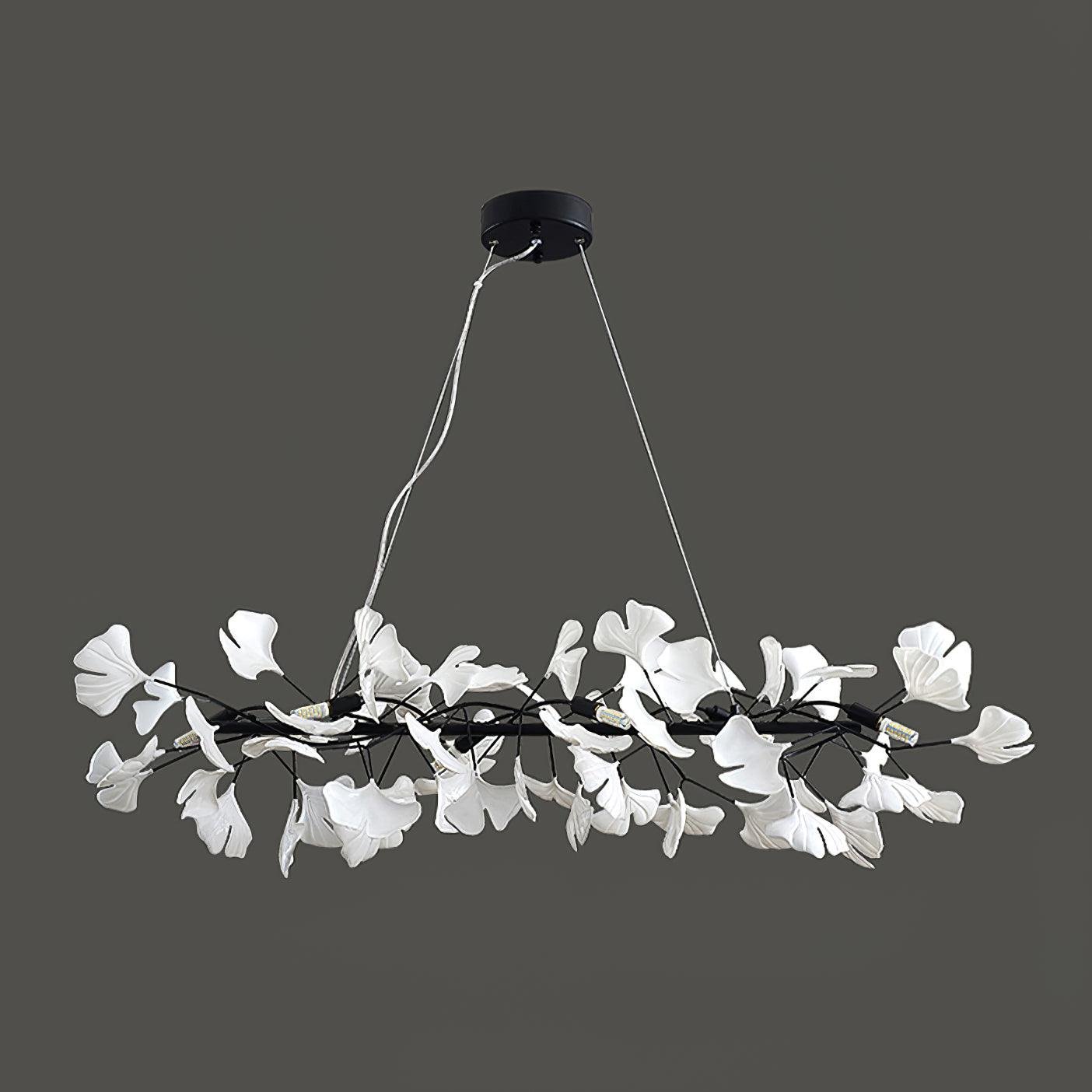 This elegant chandelier features a metal lamp body adorned with handcrafted ceramic ginkgo tree petals, showcasing a sophisticated design that blends lighting with natural botanical forms. The ceramic petals contribute to its distinctive aesthetic and refined manufacturing.