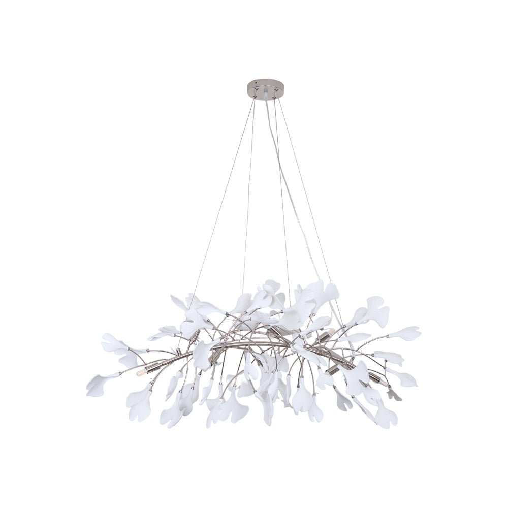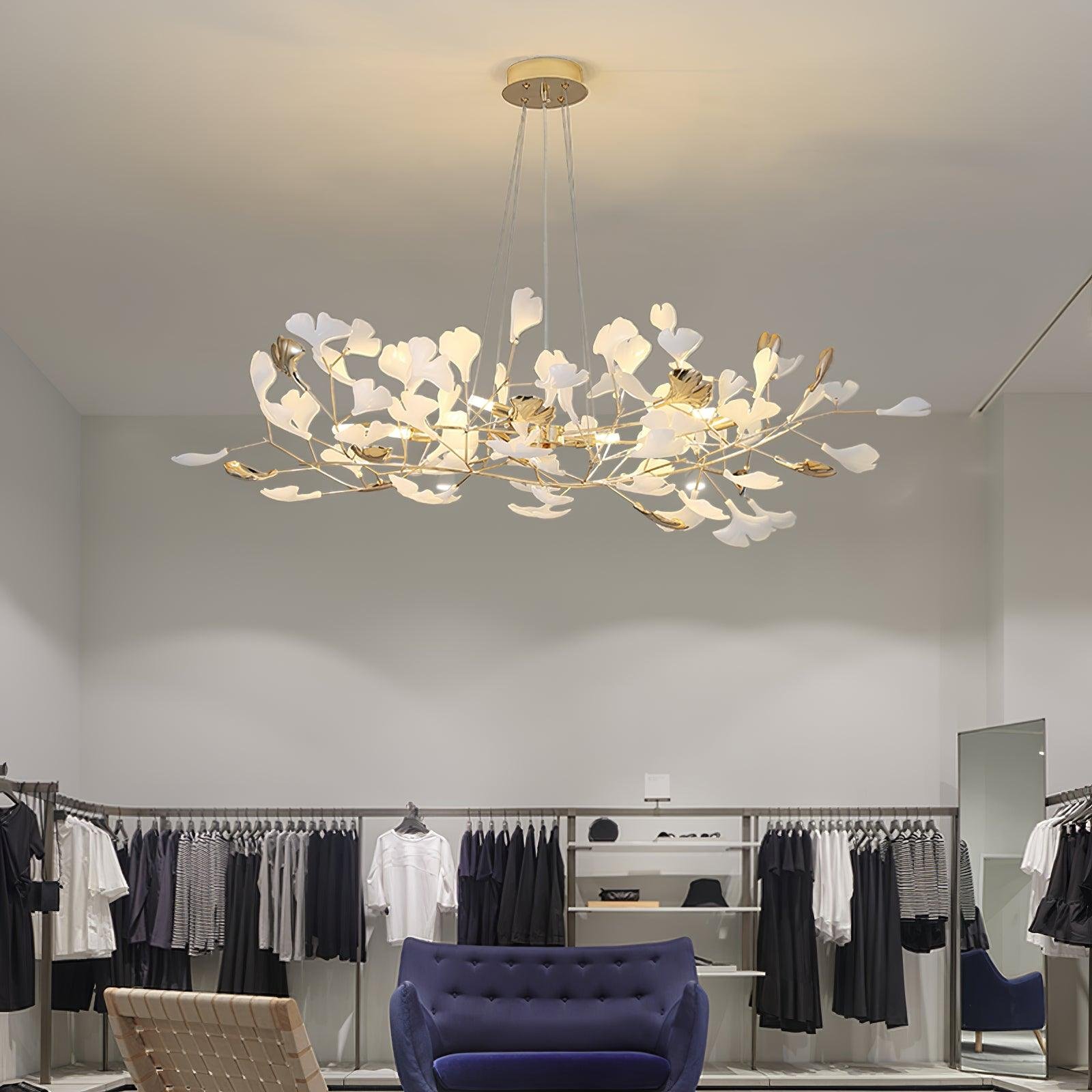 This ceramic ginkgo tree petal chandelier features a metal lamp body adorned with ceramic petals. The design combines lighting aesthetics with elements inspired by nature.
