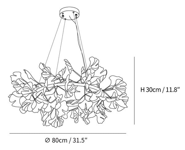 This chandelier features a metal lamp body adorned with exquisite ceramic ginkgo tree petals. The design combines lighting with natural plant aesthetics.