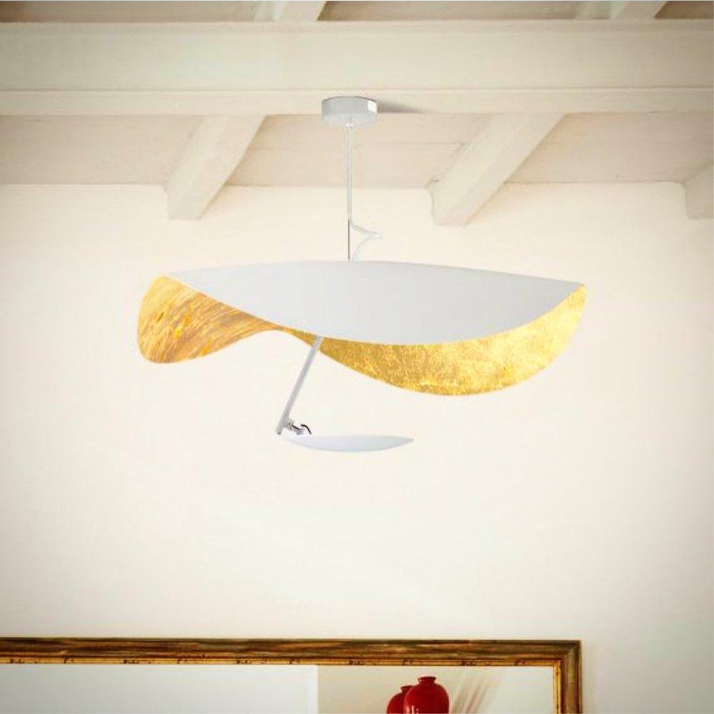The Giorgio Pendant Light features a gracefully curving shade that embodies fluidity and the accuracy of the motion required to draw a line, with a disc shade extending out with a metal rod. Finished in White with the option of a White, Satin, or Gold rod. May be ceiling or wall-mounted.