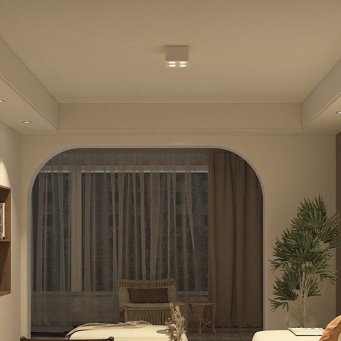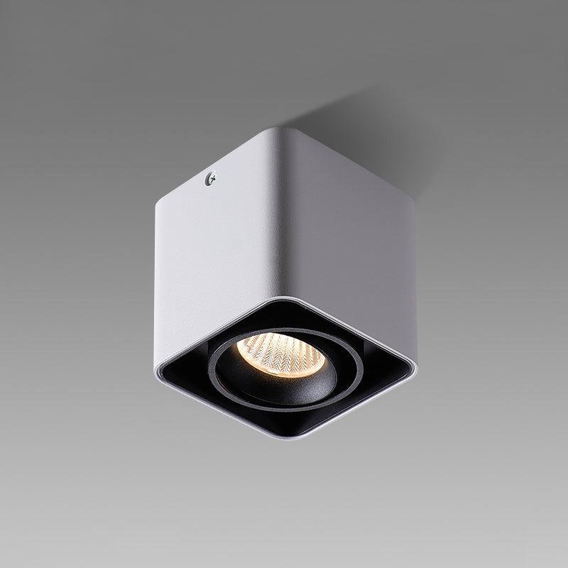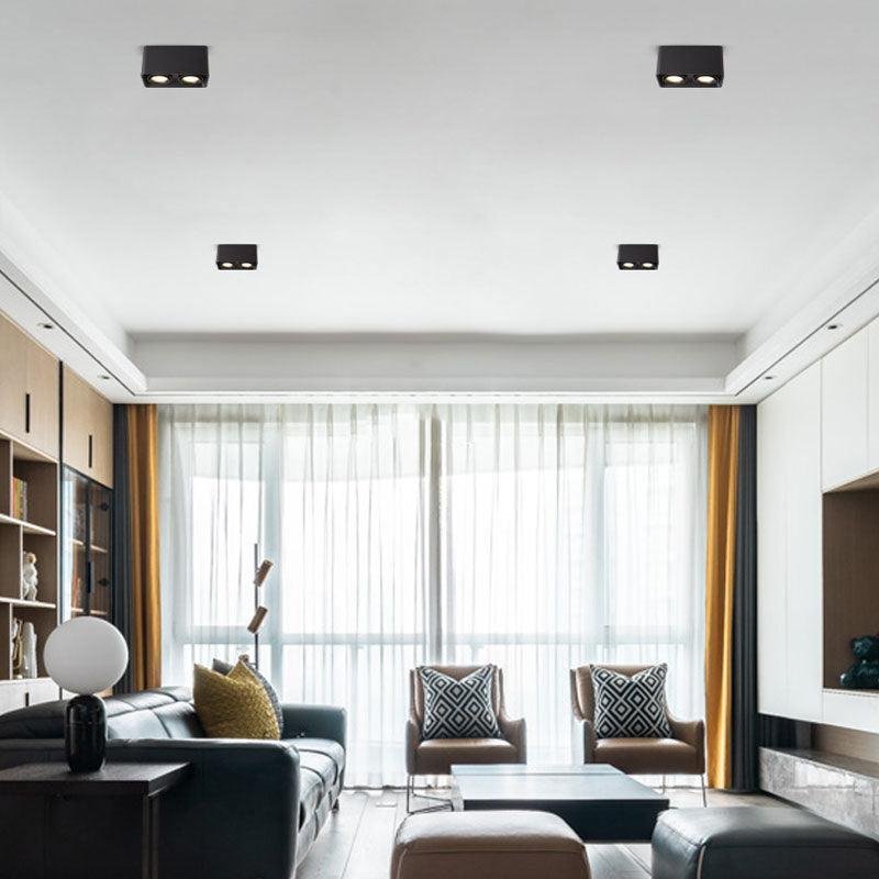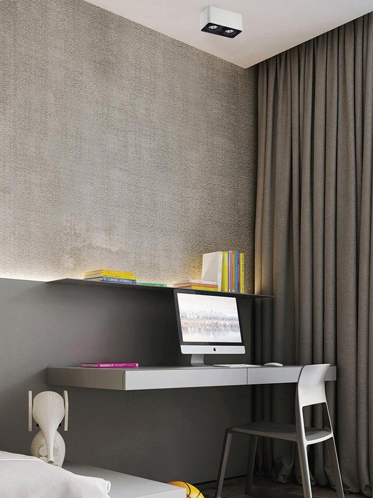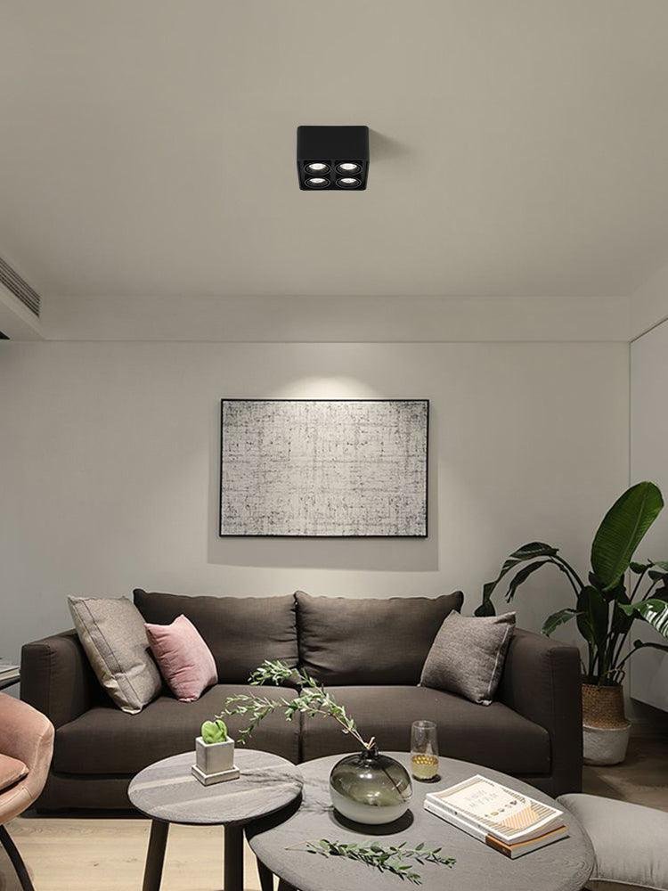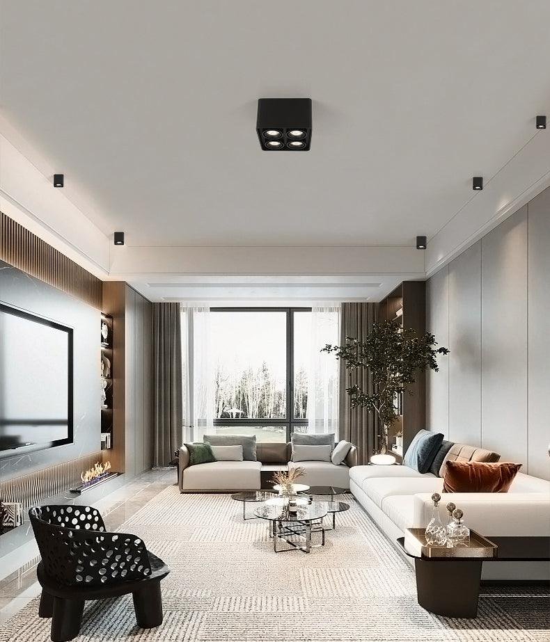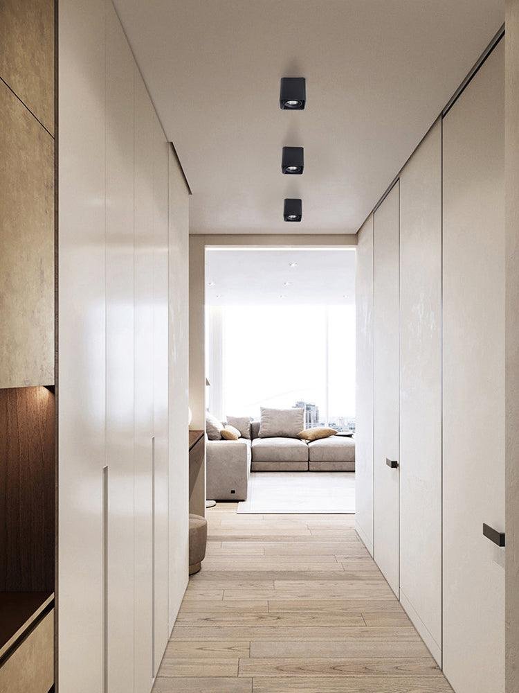 The Giyan surface-mounted light features an angular design crafted from steel, sitting directly on the ceiling to create discreet accents. It integrates into various interior styles, suitable for apartment living spaces or commercial shop lighting.