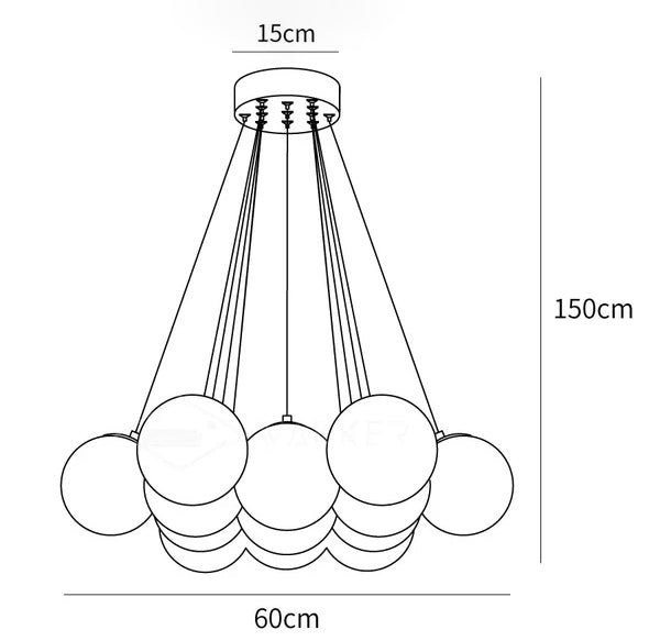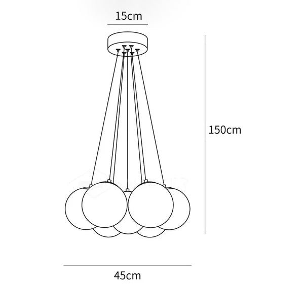 Each glass globe has a 150-millimeter diameter, designed to provide diffused illumination. The fixture’s clean design allows for versatile application in various interior settings.