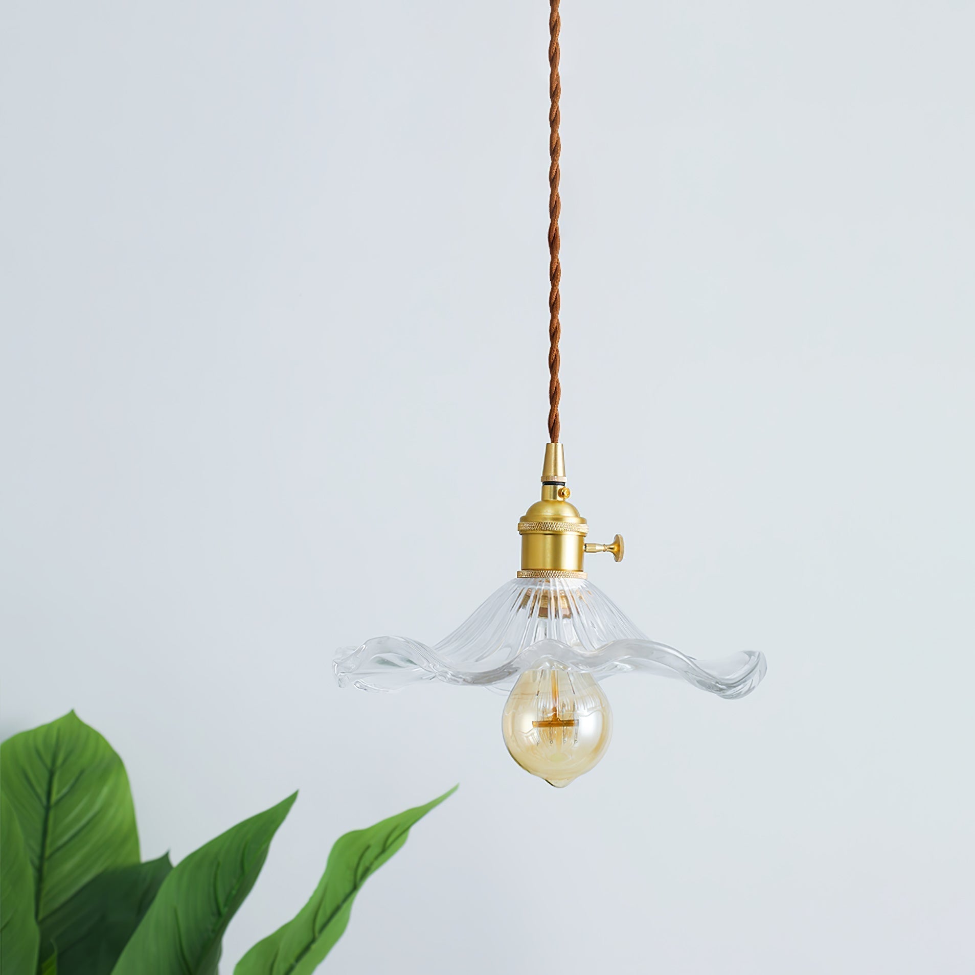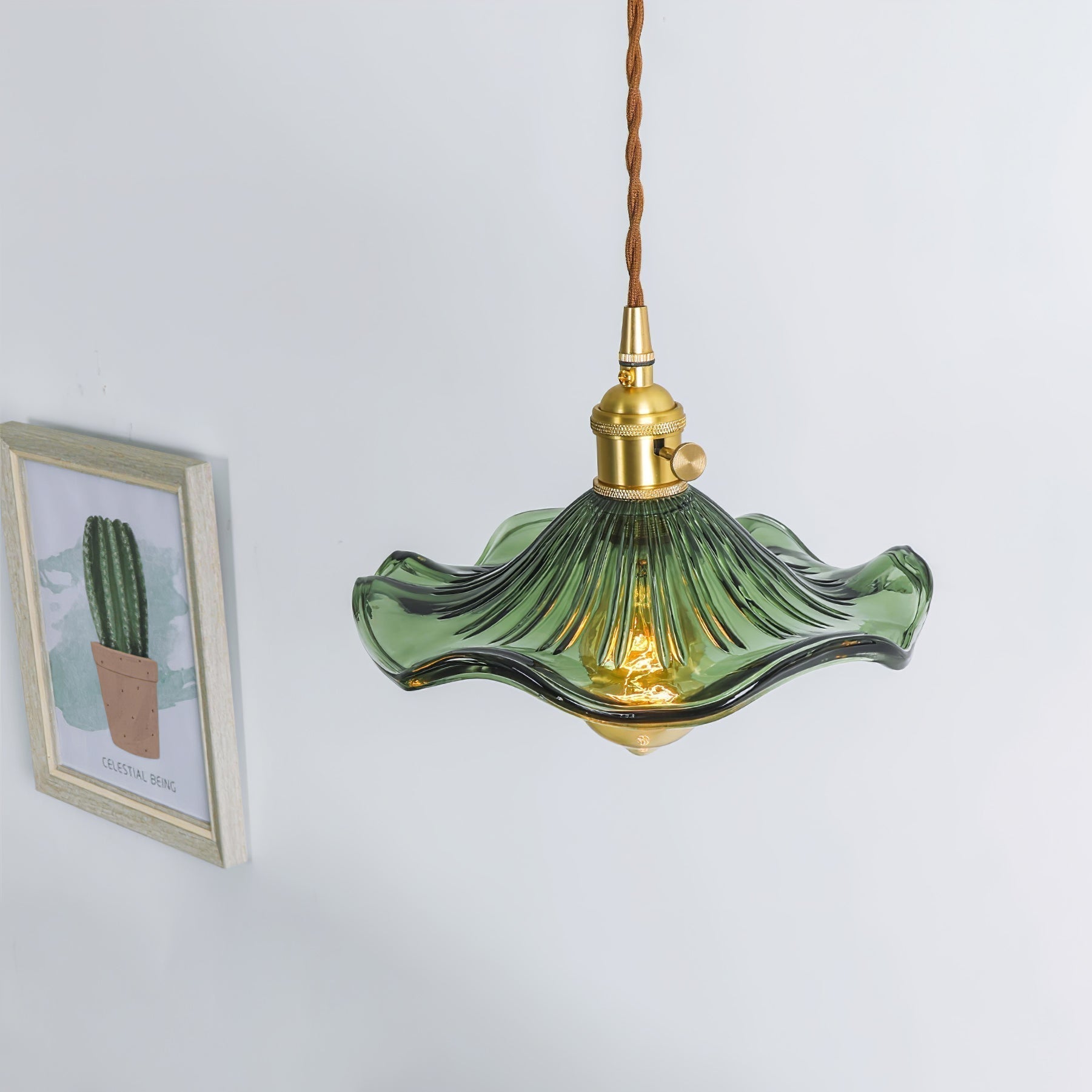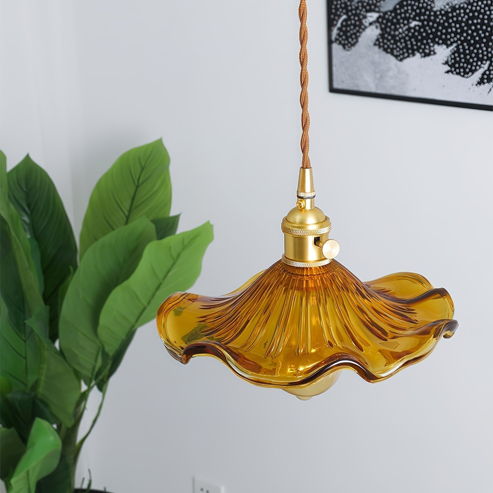 The Glass Hibiscus Flower Swag Light features an Art Nouveau-inspired design, characterized by its fluted glass lampshade and brushed brass lamp holder. This flower-shaped pendant light provides functional illumination with a classic aesthetic, suitable for various interior environments.