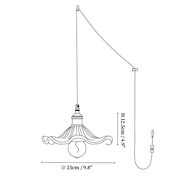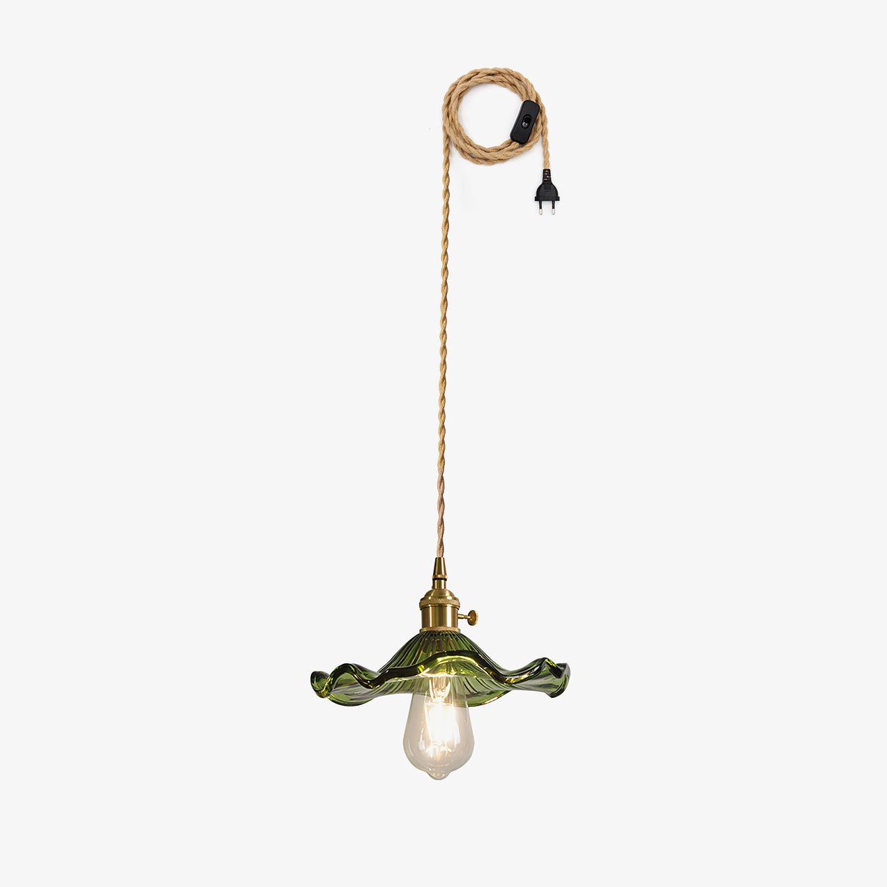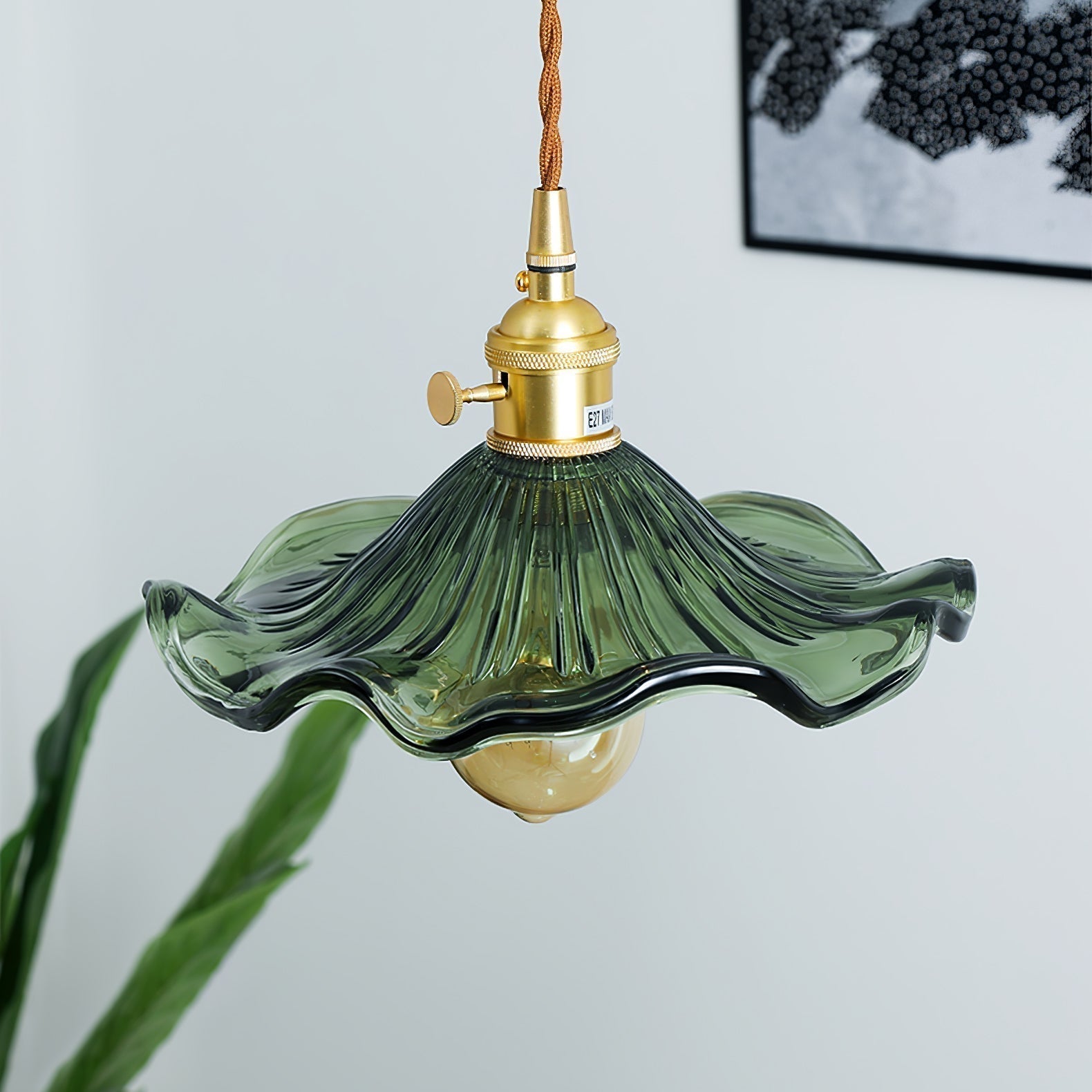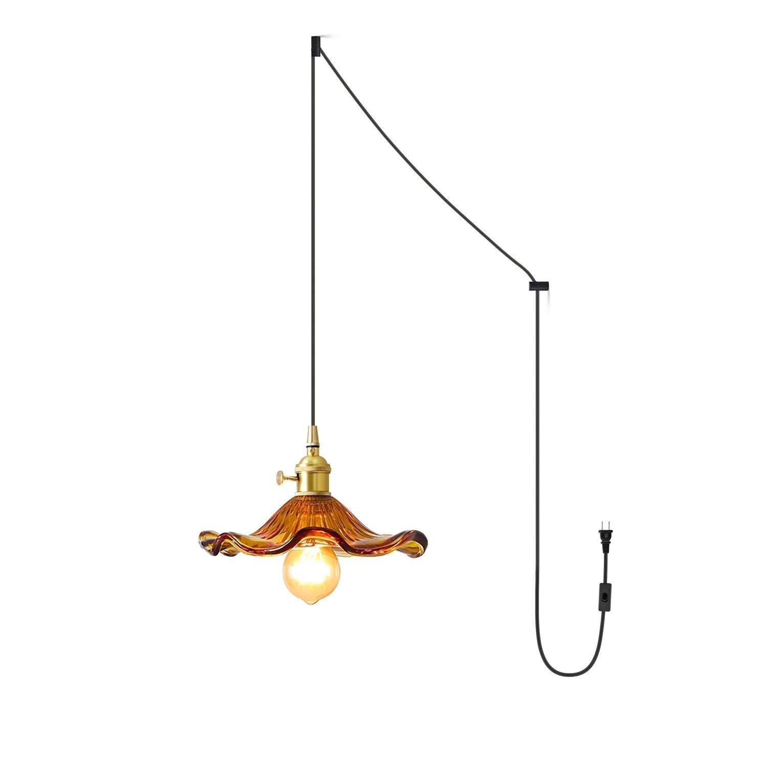 The Glass Hibiscus Flower Swag Light features an Art Nouveau-inspired design, characterized by its fluted glass lampshade and brushed brass lamp holder. This flower-shaped pendant light provides functional illumination with a classic aesthetic, suitable for various interior environments.