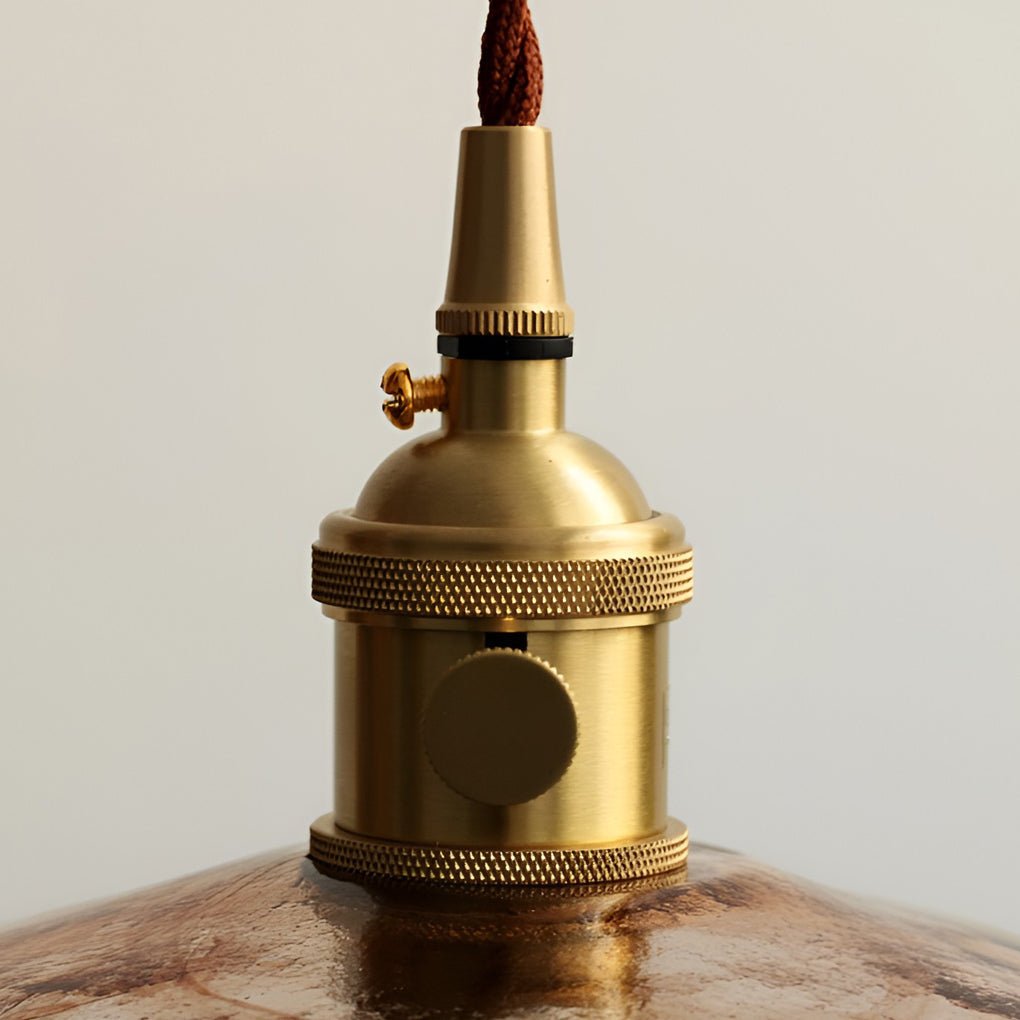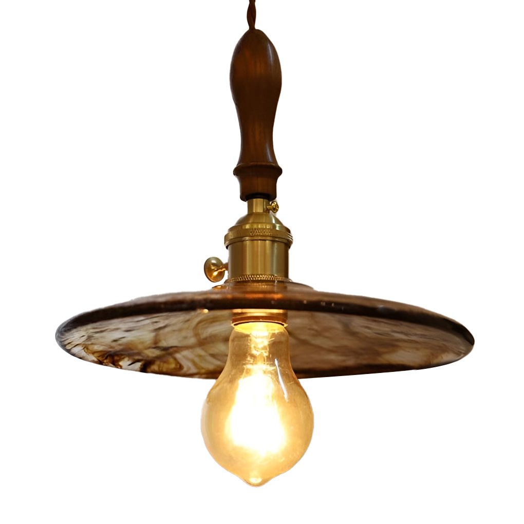- When illuminated, this single pendant lamp provides effective light distribution throughout the room. The combination of retro walnut wood, a brass lamp head, and a glass lampshade presents a simple, clean style that complements room decor.