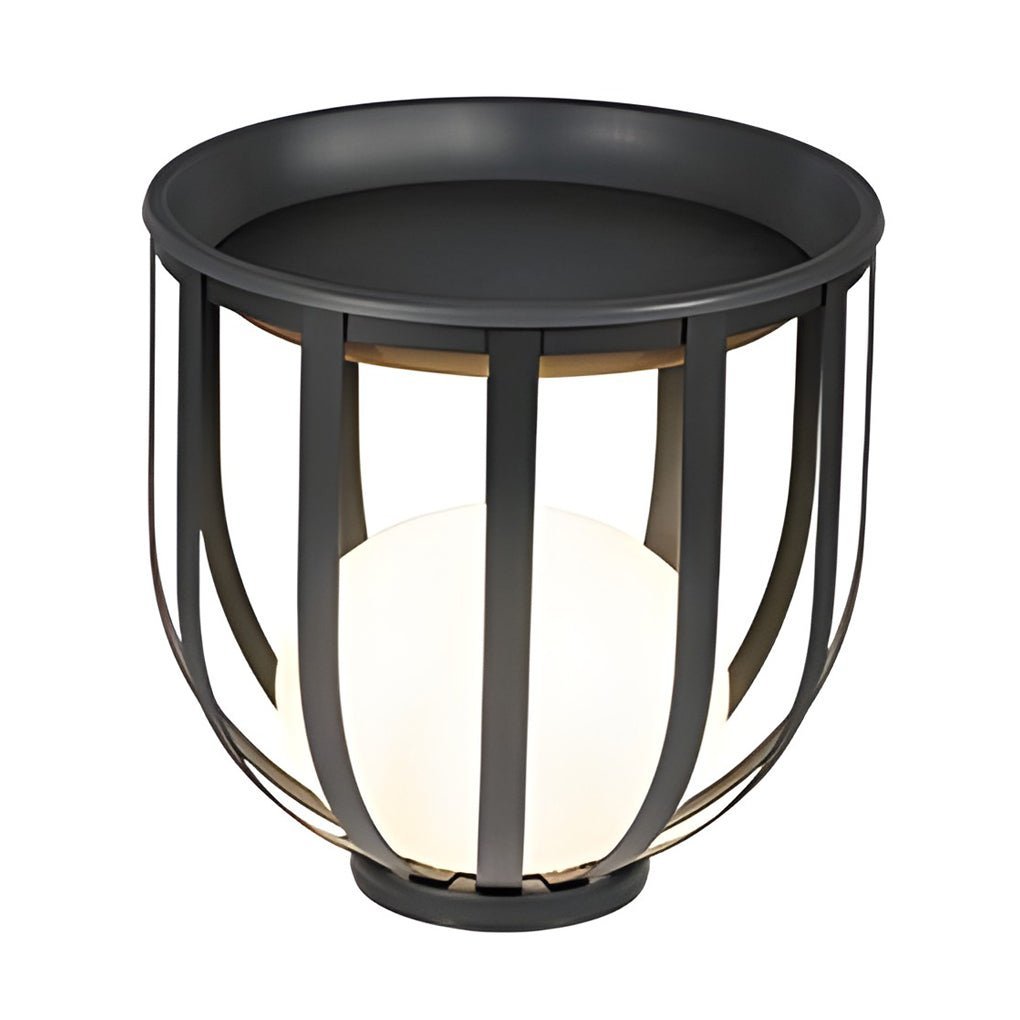 • This industrial style outdoor floor lamp features a metal and PC lantern shape with a bright warm white solar-LED sphere and a functional top tray design. It is suitable for gardens, stairways, pathways, and courtyards.