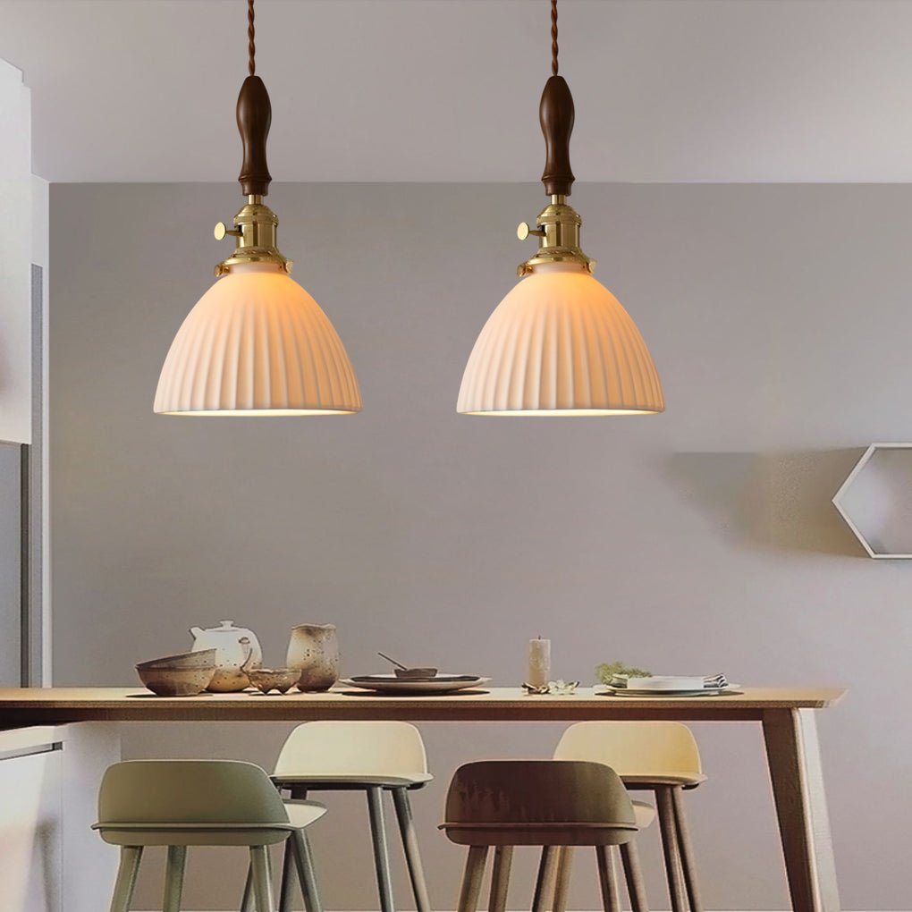 - The pendant lamp features a durable copper frame and a ceramic lampshade, designed for stability and prolonged use. It offers ambient illumination for various indoor settings.
