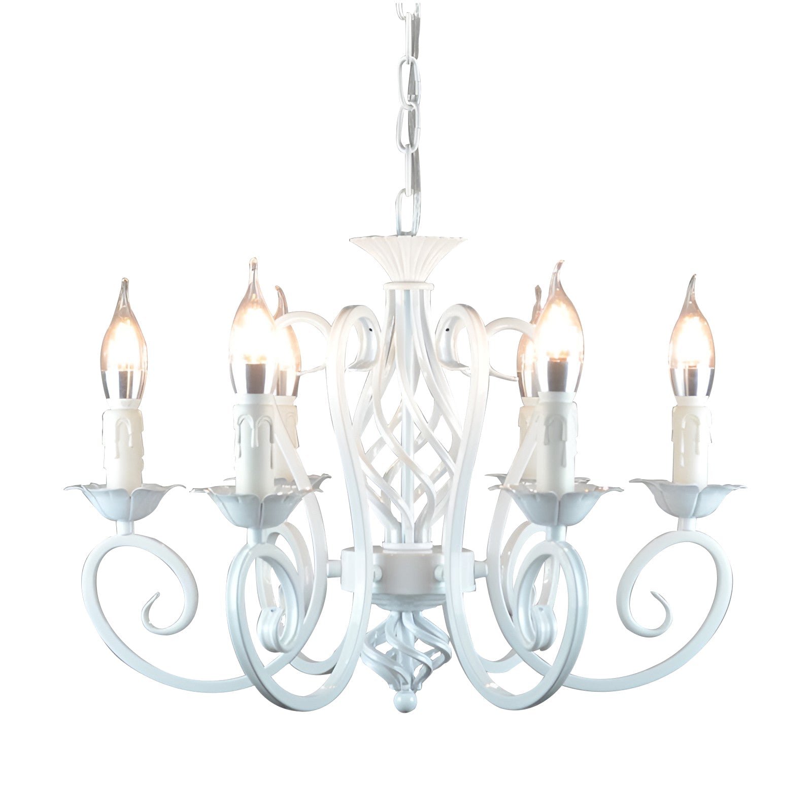 This Minihouzz chandelier features a traditional, classic candle-style design, suitable for living rooms. Constructed from durable metal with a painted finish, it provides ambient light through six bulbs (not included) with E12/E14 bases, supporting up to 45W per bulb. It is compatible with incandescent and LED bulb types, operating at 110-120V.