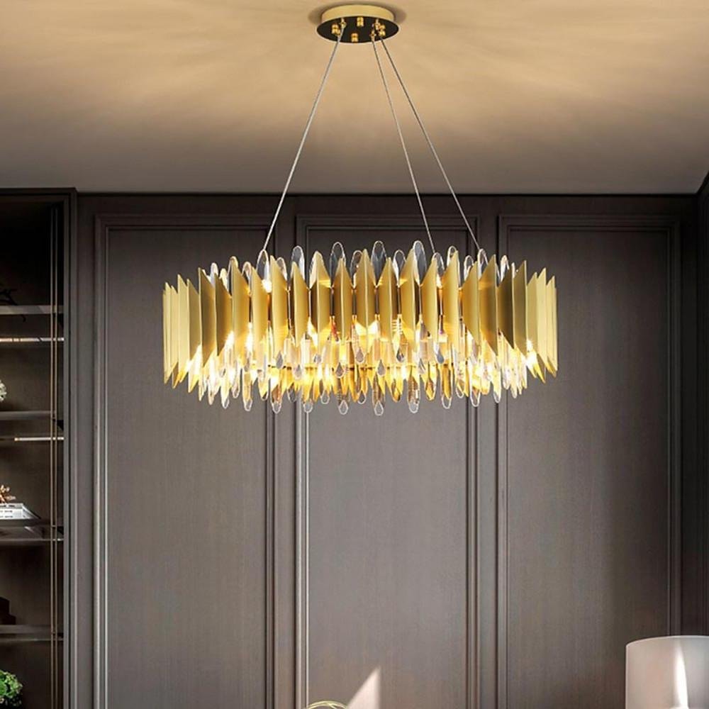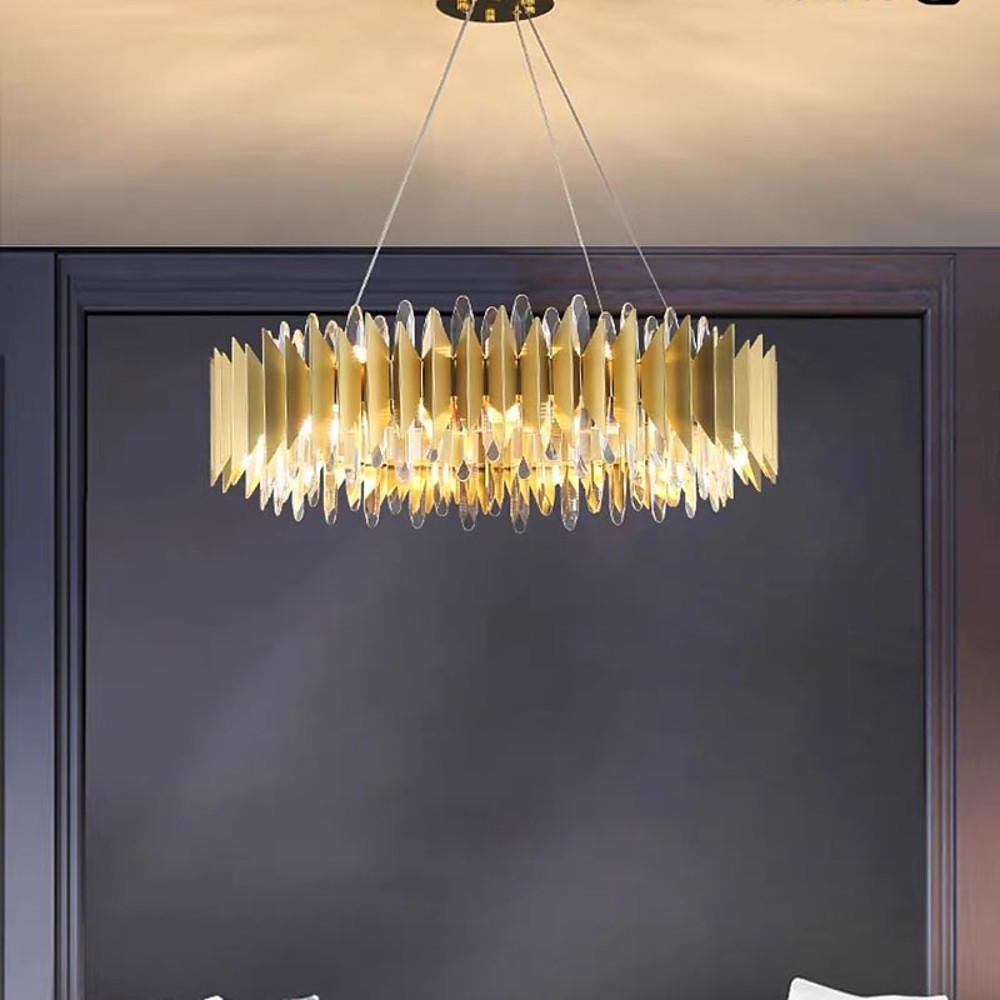 - An outer ring of electroplated stainless steel complements the crystal shade, offering a modern aesthetic suitable for various rooms including the living room, bedroom, dining room, kitchen, hallway, and office.