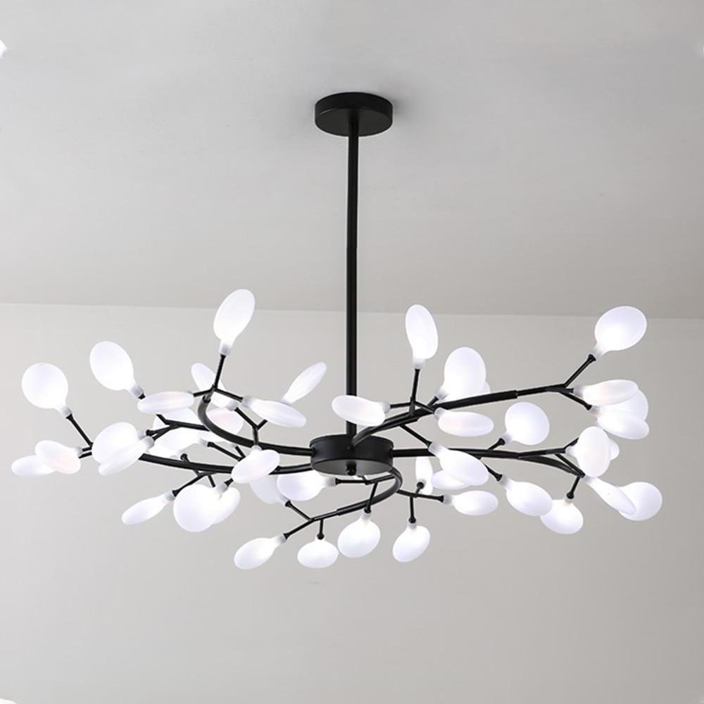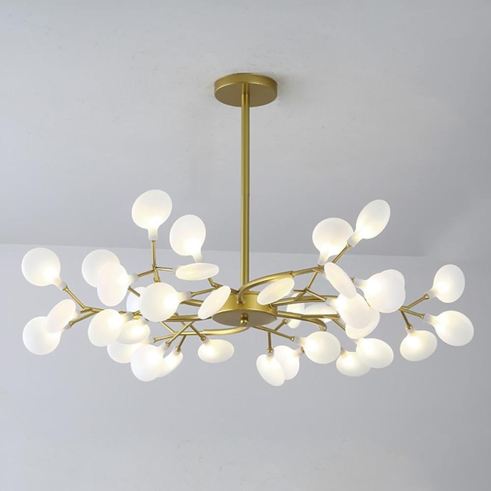 - This contemporary satellite chandelier features a unique design, drawing attention with its distinctive aesthetic. The metal lamp holders and lamp beads are linked with white acrylic lampshades, resembling a branch full of flowers.