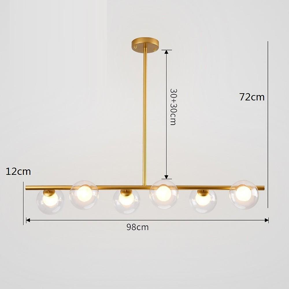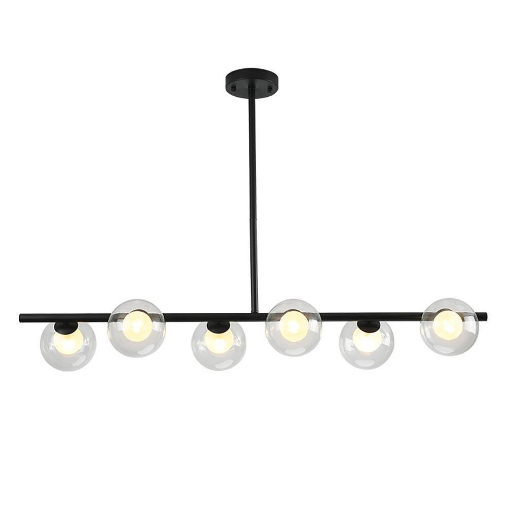 - The Minihouzz chandelier features six spherical glass lampshades and a metal fixture.