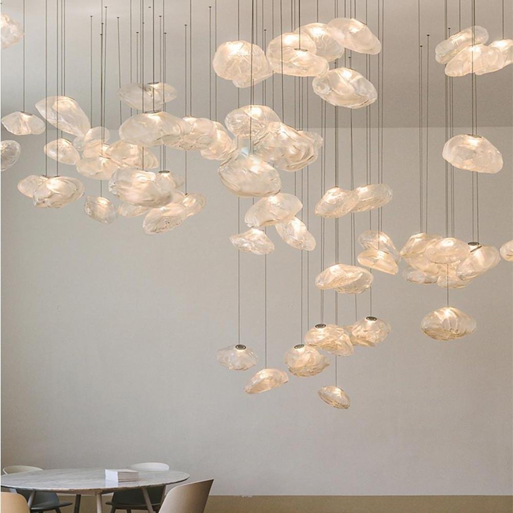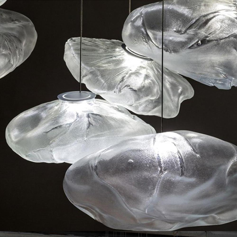 This pendant lighting fixture features a glass lampshade with an irregular design, providing ambient illumination. The contemporary industrial style fixture is designed to enhance indoor lighting in various settings.