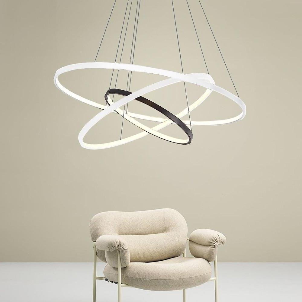 The ring-shaped pendant light is designed to serve as a focal point within a room. It features an integrated LED light source, providing illumination throughout the space. The chandelier is dimmable, offering adjustable brightness and color temperature settings via a remote control.