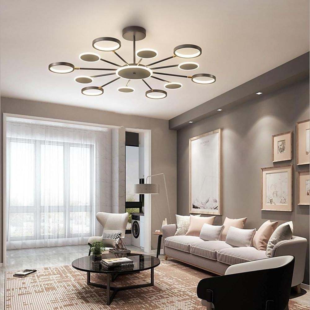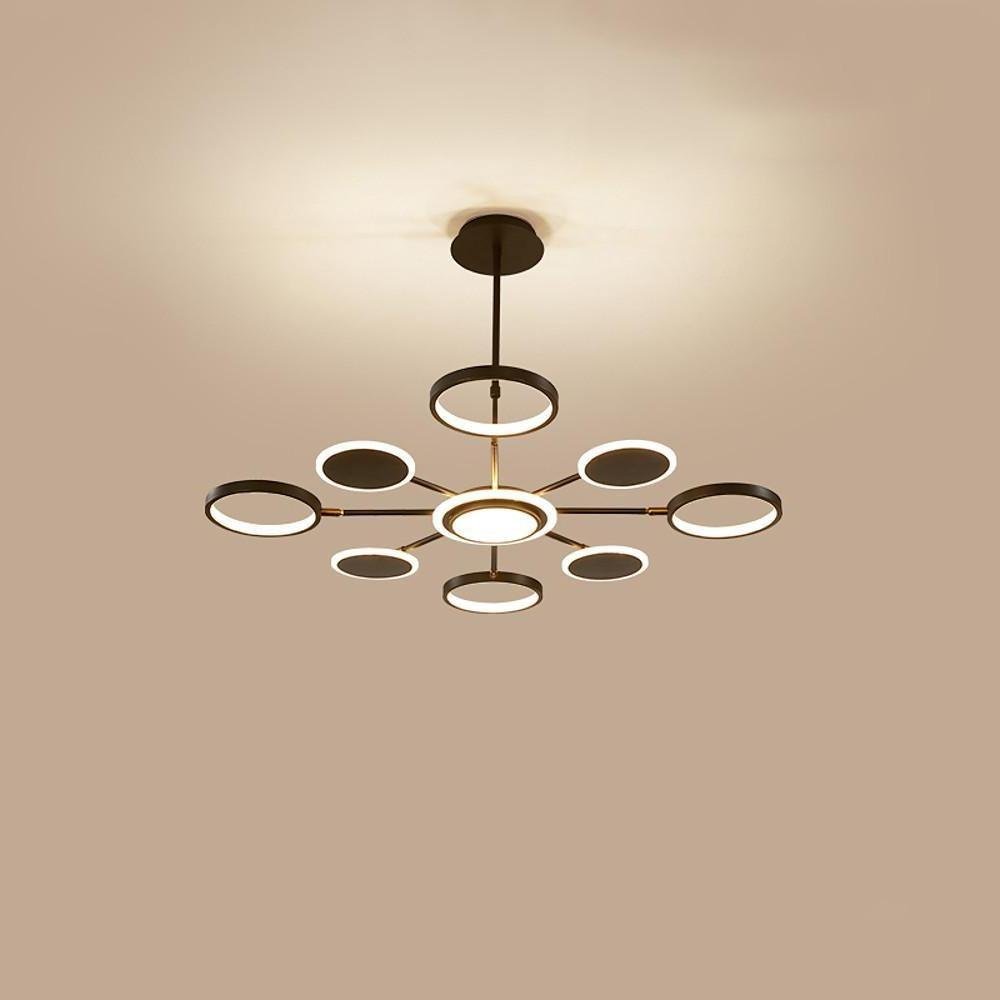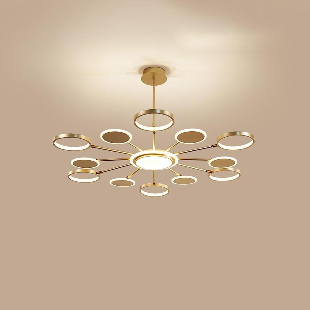 This distinctively shaped chandelier features multiple circles and rings, creating an aesthetic reminiscent of a dandelion or a blooming firework. Designed for various indoor settings, it provides ambient illumination with a modern touch.