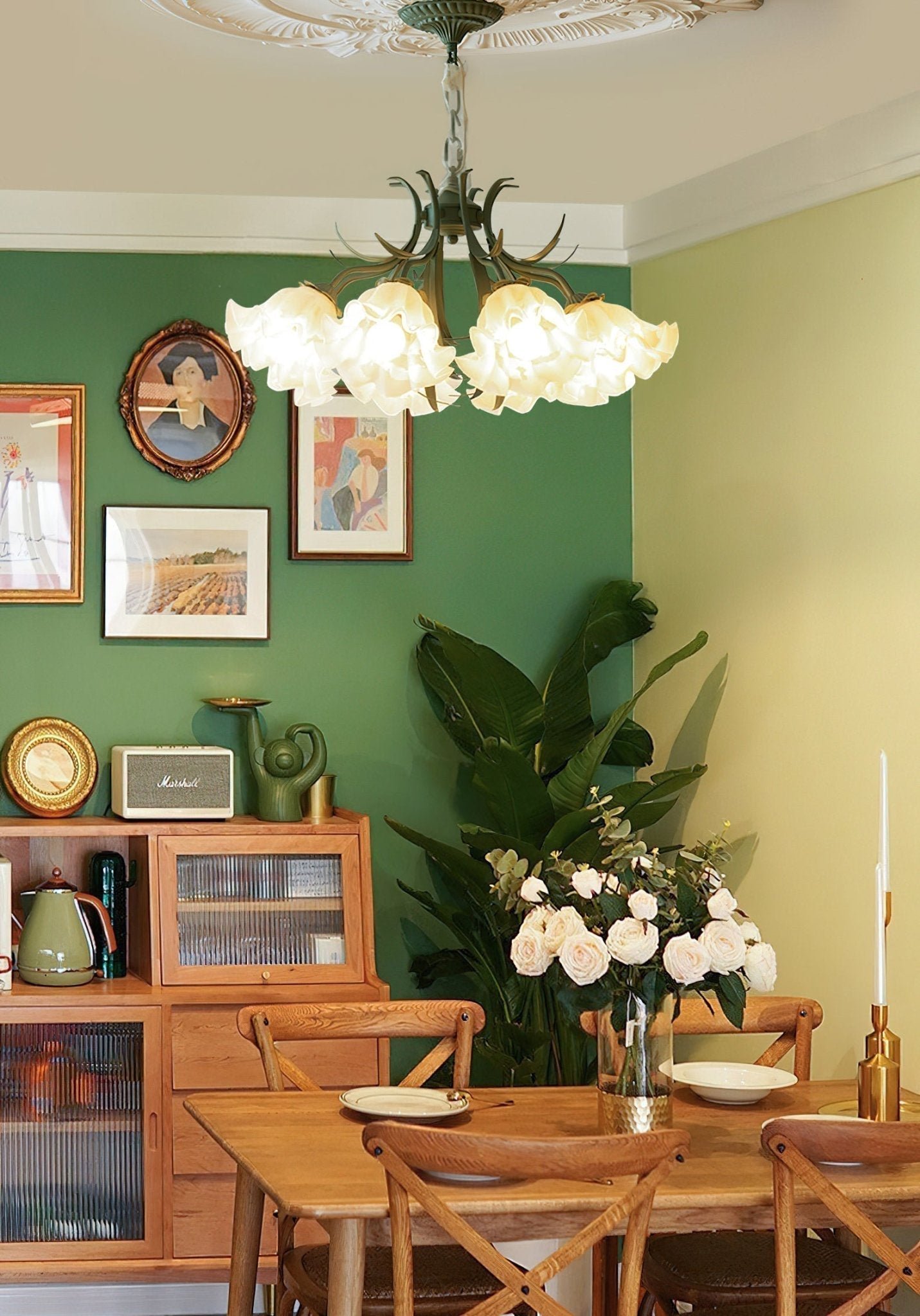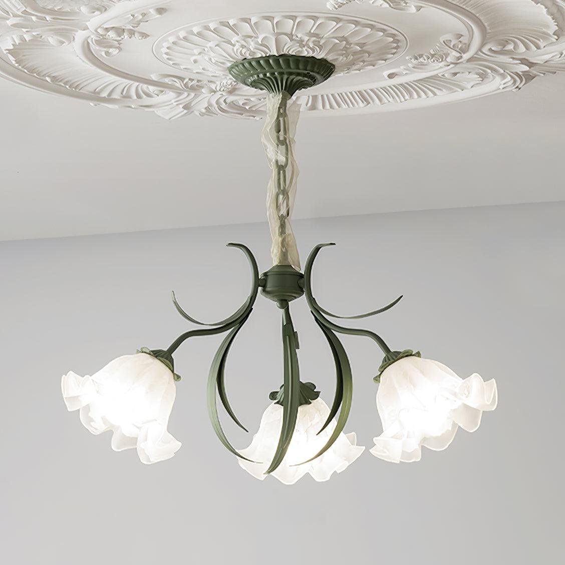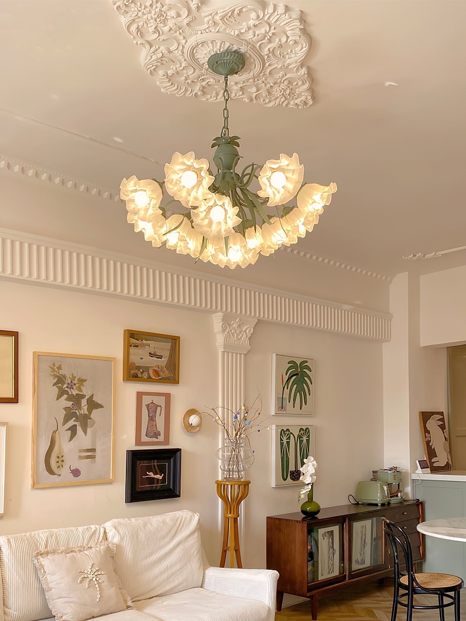 This chandelier is designed with an aesthetic inspired by a bouquet of lily of the valley. Crafted from metal, it features petal-shaped elements and draped leaves, creating a whimsical and romantic visual appeal.