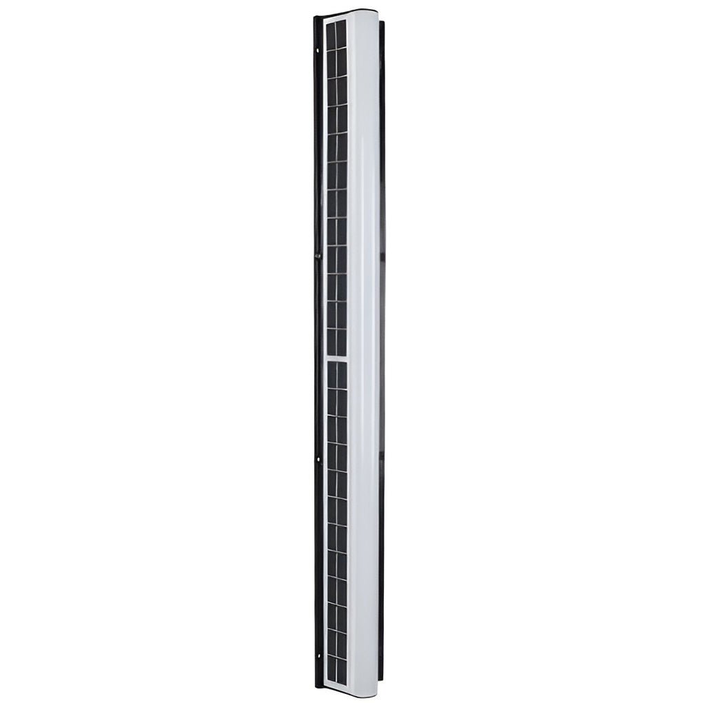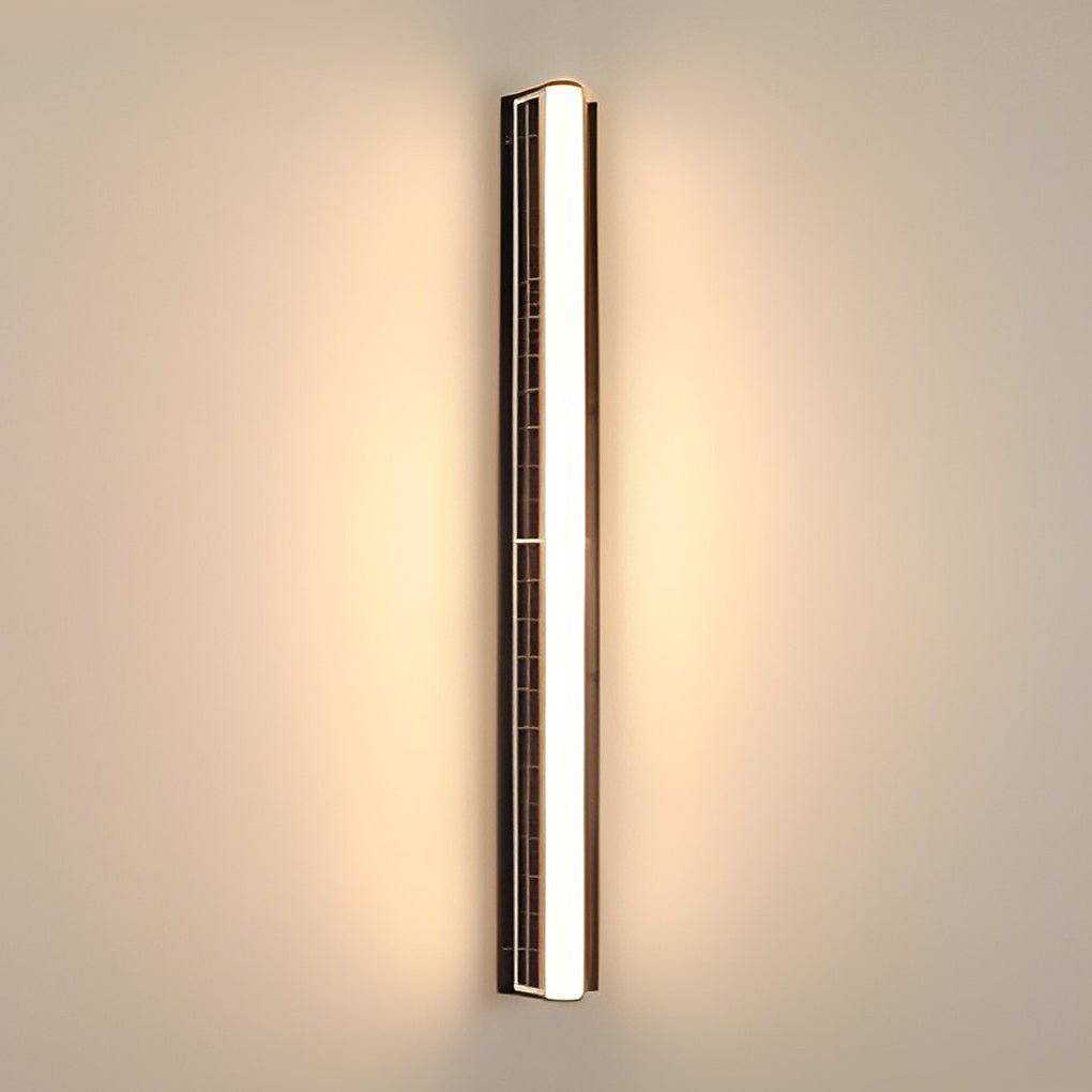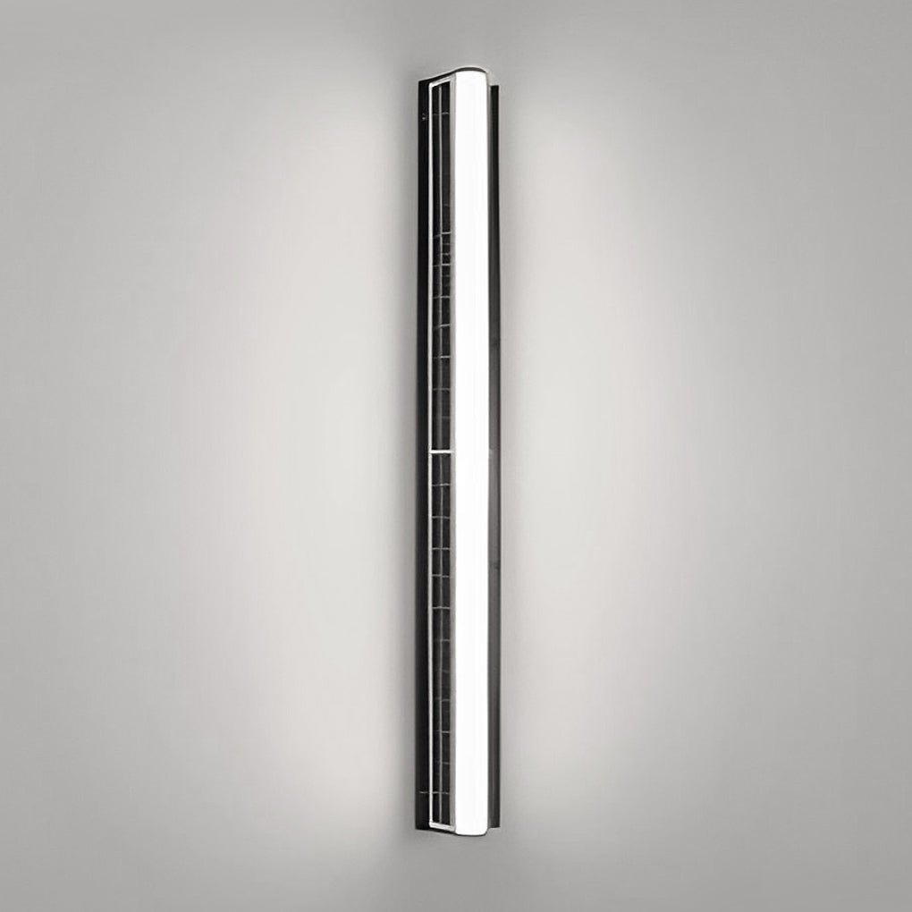 This long, minimalist solar LED outdoor wall light features an acrylic diffuser and is designed for exterior illumination. Its solar-powered design offers an energy-saving lighting solution for outdoor spaces.