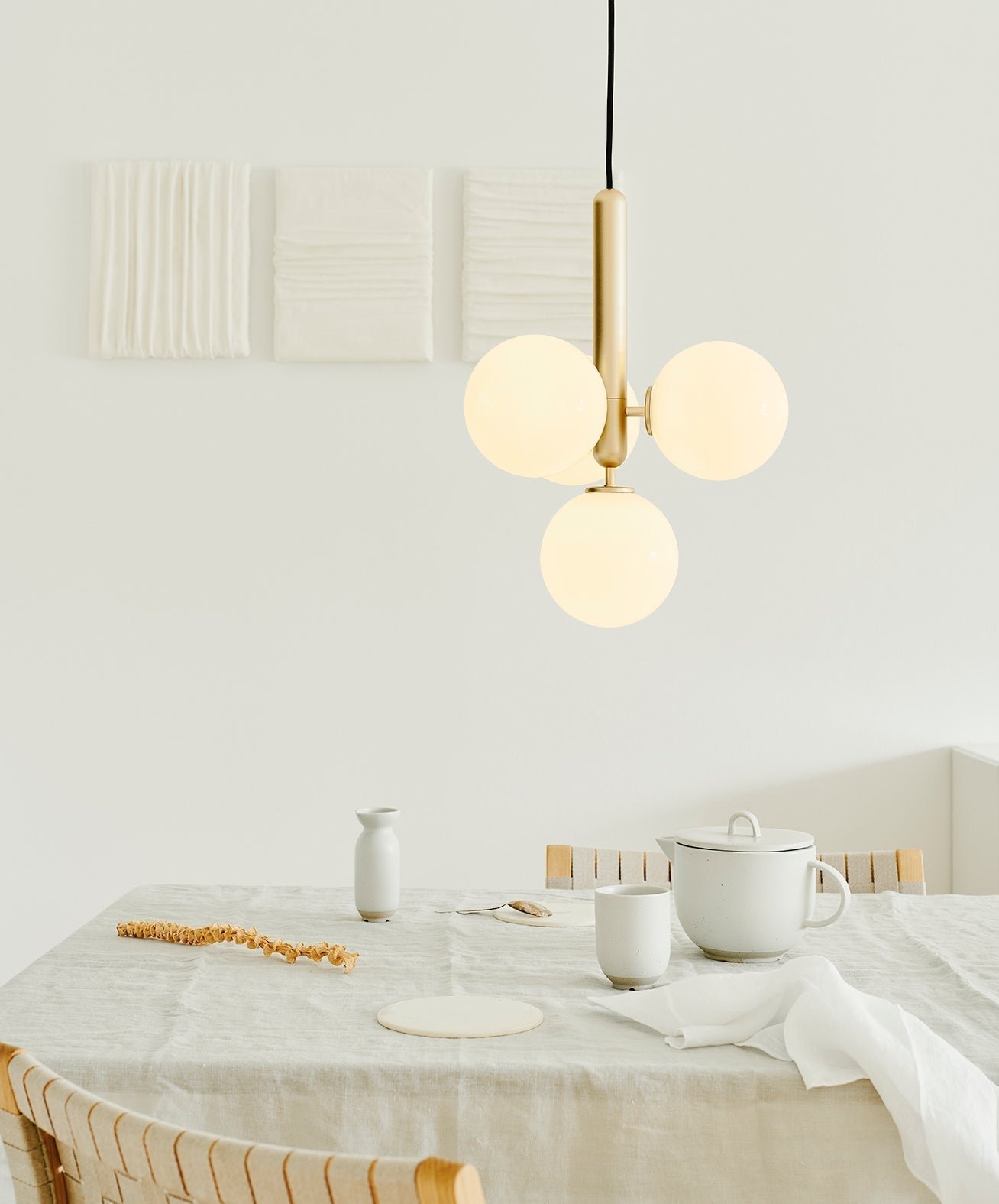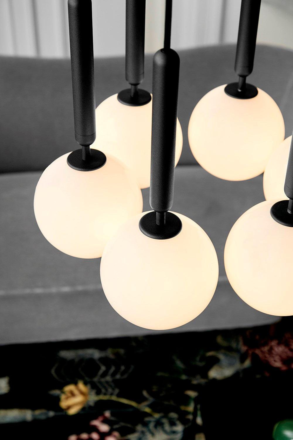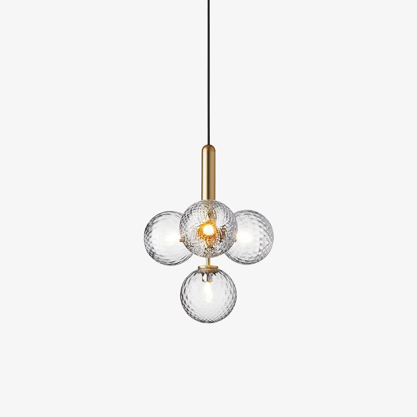 The Luminae Pendant Light features mouth-blown glass spheres paired with a sleek, crafted metal structure, embodying a sense of balance and depth. The Optic Clear glass version, with its distinctive embossed pattern, adds a vibrant atmosphere, while the Opal glass version offers a warm and inviting glow.