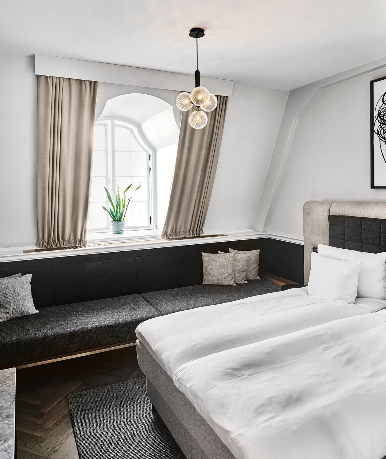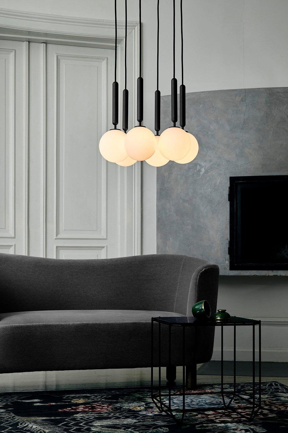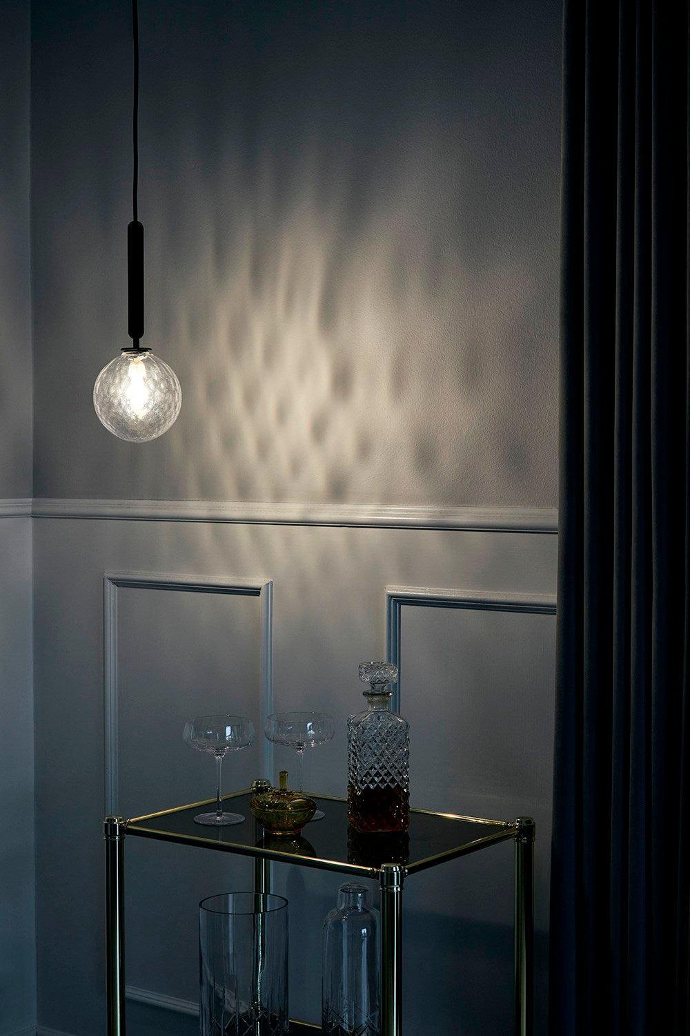 The Luminae Pendant Light features mouth-blown glass spheres paired with a sleek, crafted metal structure, embodying a sense of balance and depth. The Optic Clear glass version, with its distinctive embossed pattern, adds a vibrant atmosphere, while the Opal glass version offers a warm and inviting glow.
